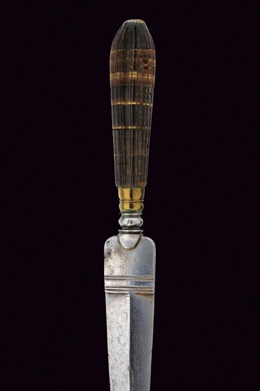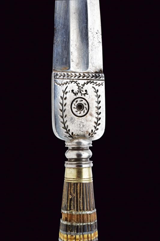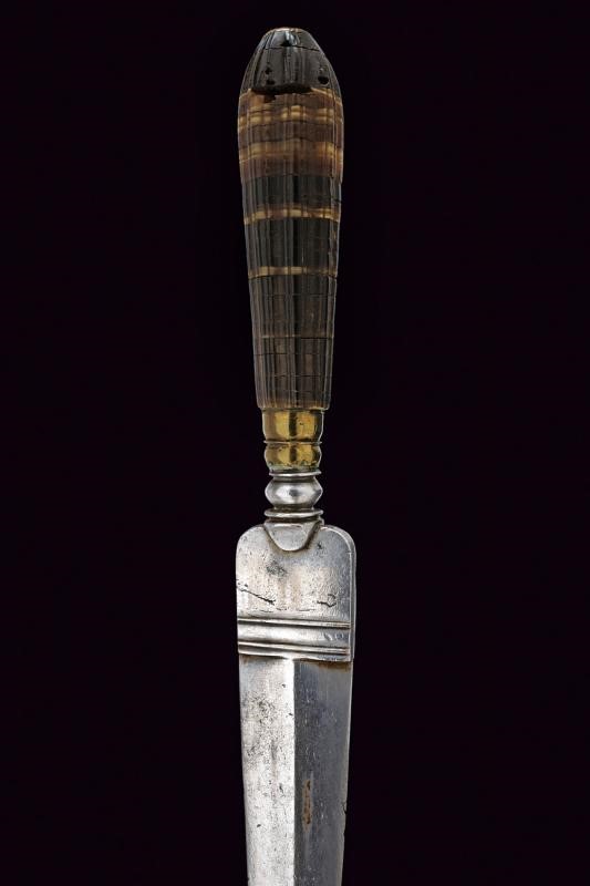 One with a straight, double-edged blade with central fuller, the tang engraved with floral motifs. The other with a double-edged blade ribbed in the middle. Both with horn grip with discs (missing parts) and leather scabbard. The shorter one with white metal mounts, the other without.