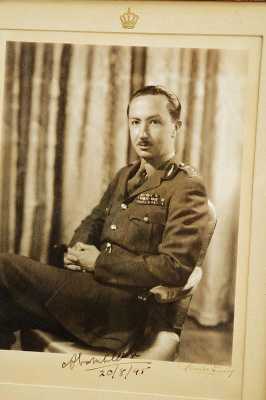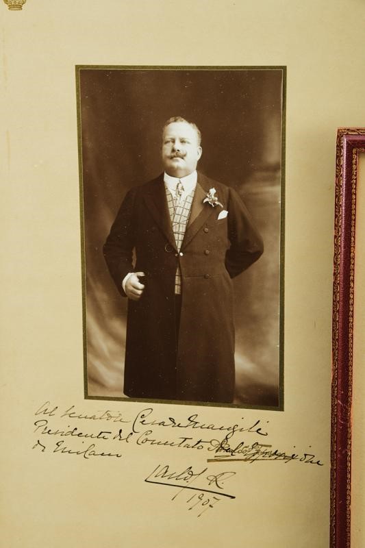 The first one depicts a member of a royal family with a dedication to Senator Cesare Mangili, President of the Milan Exhibition Committee (in 1906), with a signature and date "1907". In a beautiful stuccoed and gilded wooden frame, topped with a crown. The second photograph depicts a member of a royal family in English uniform, signed in ink (not very legible) and dated "20/8/45". In a leather-like frame featuring gilded borders, passepartout with a golden crown, under glass.