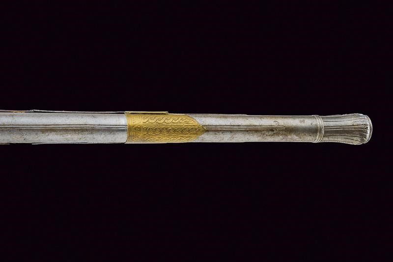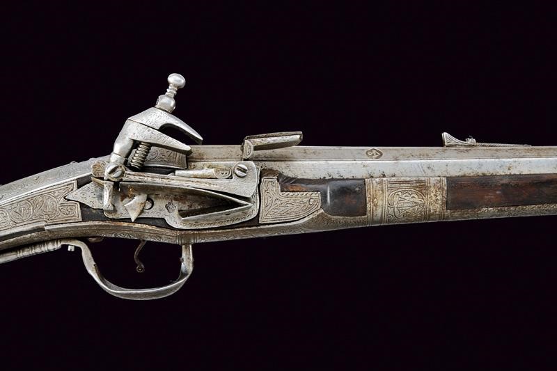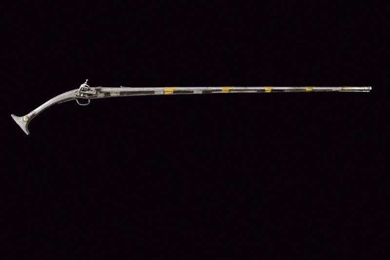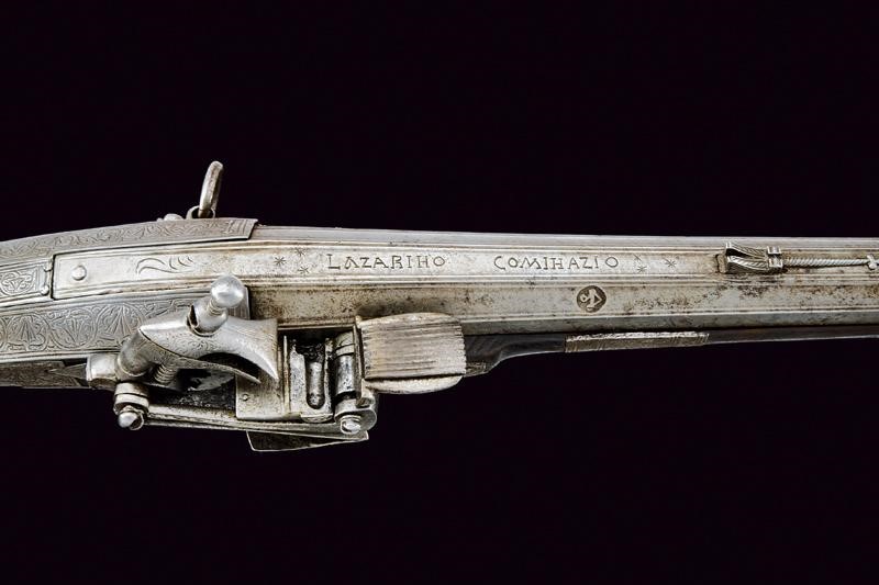 Smoothbore, two-stage, octagonal and round, 16, 2 mm cal. barrel, decorated in the first part with longitudinal ribs, provided with mark, and marked "LAZARIHO COMIHAZIO" (sic!), carved rear sight, ornamented at the girdle with mouldings and floral engravings, featuring in the round part a thin, dorsal rib and in the nozzle, moulded muzzle engraved and with a small foresight. Iron morlach lock, with mark and slightly floral engravings. Wooden stock lined for the most part with iron plates, richly engraved with floral motifs. Four brass barrel bracket. Iron ramrod. Suspension ring on the left side. Iron trigger guard engraved like the other elements.