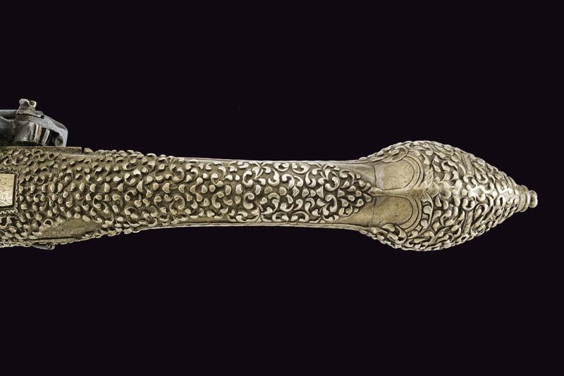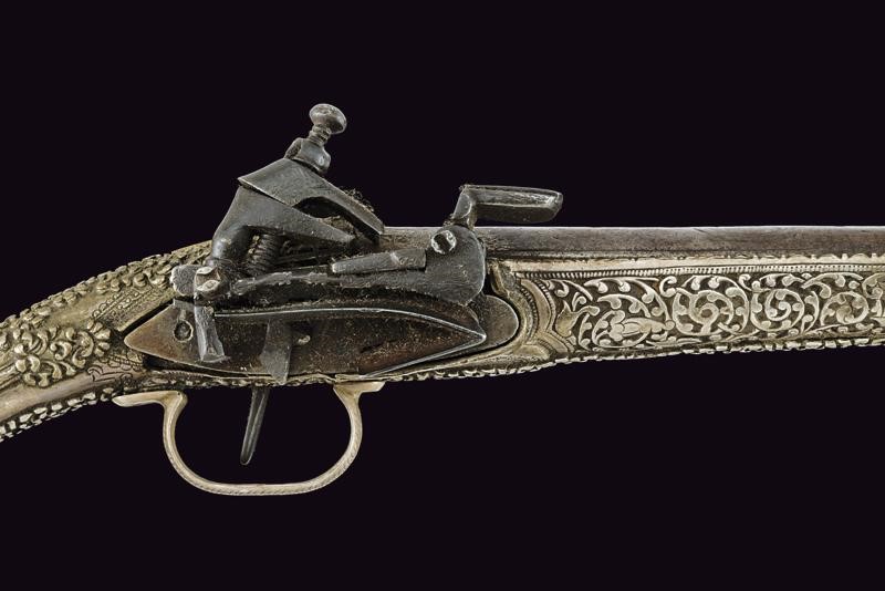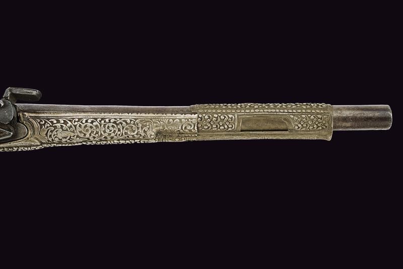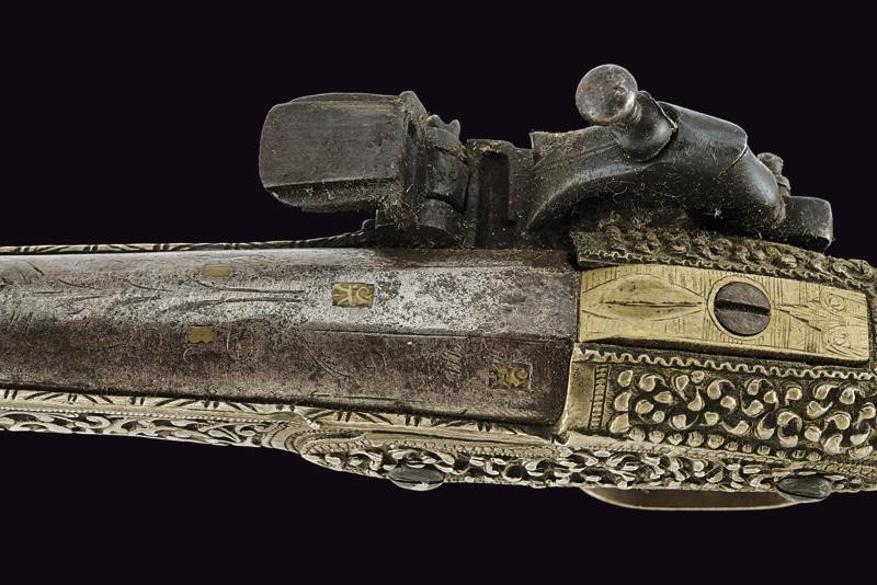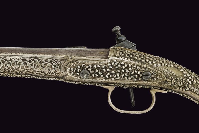 Smoothbore, round, 14 mm cal. barrel, with square base and a brass-inlaid mark, sober engravings; tang covered with brass and provided with sight; miquelet lock with remains of engravings. Stock entirely made of silver richly decorated with floral motifs in bas-relief (small missing part). Engraved trigger guard.