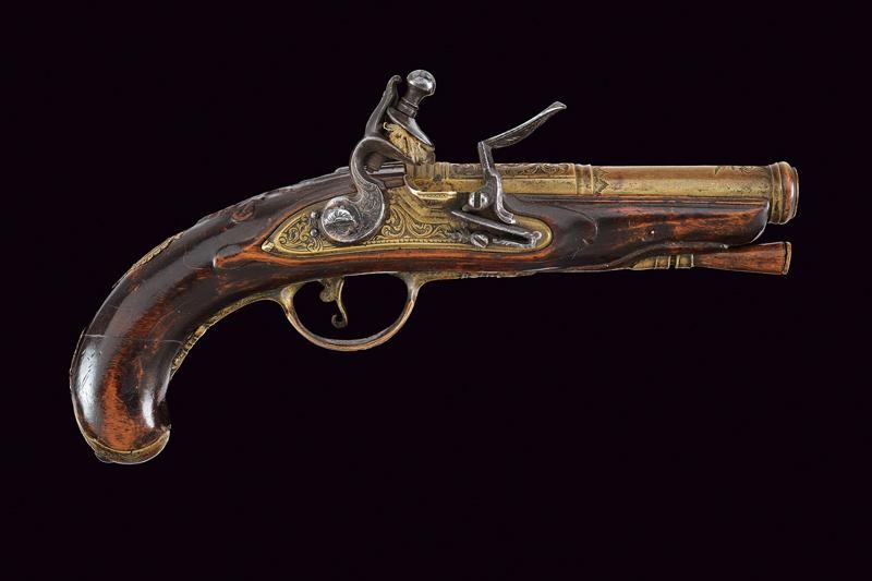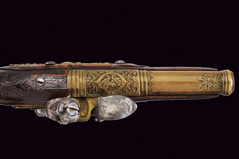 Smoothbore, bronze, two-stage, 10 mm cal barrel, octagonal and engraved with a bust among floral motifs on the first part, the round part engraved and with moulded nozzle; engraved iron tang. Brass lock decorated en suite, iron hammer, batterie, spring and trigger (one screw is broken). Wooden full stock (a crack at the handle) with brass mounts decorated en suite with the barrel. Brass-tipped, wooden ramrod.