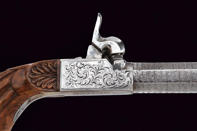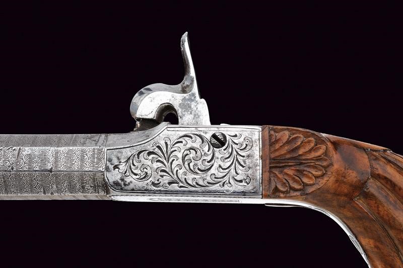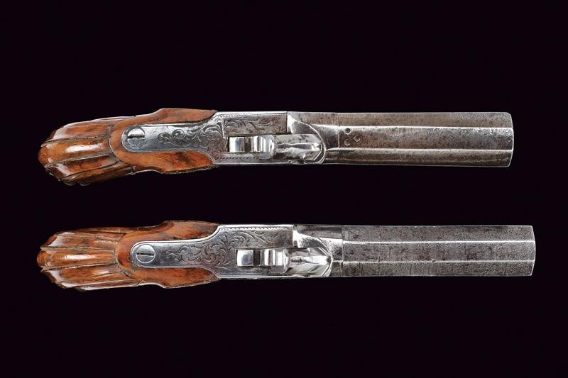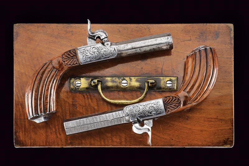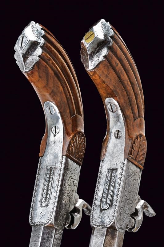 Round, smoothbore, damask, 11.5 mm cal barrel (one of the pocket pistol with the barrel replaced and, therefore, different from the original, the change was made in time of use; the replacement barrel is made of damask, but of slightly-shorter length). Finely engraved, box-lock type frames engraved with floral motifs, off-centre hammers and foresight. Foldaway trigger. Beautiful, grooved, wooden stocks, the front parted carved with a flower. Pronounced, faceted butt-plates engraved en suite with the frame. In a wooden case lined with brick-red velvet (signs of time) and provided with a single tool, lid with brass handle.