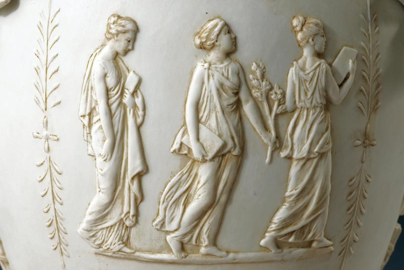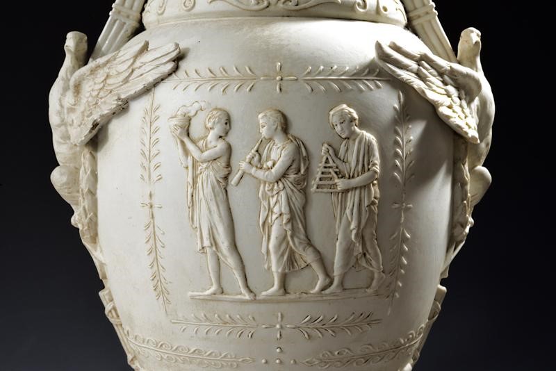 The front part with the monogram 'N' and laurel wreath, the sides with handles ending with a lion's head held by eagles above fasces; one vase with three musicians in relief on one side, and three female allegories on the other. Four-footed bases with laurel wreaths and crossed arrows.