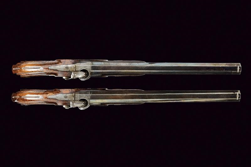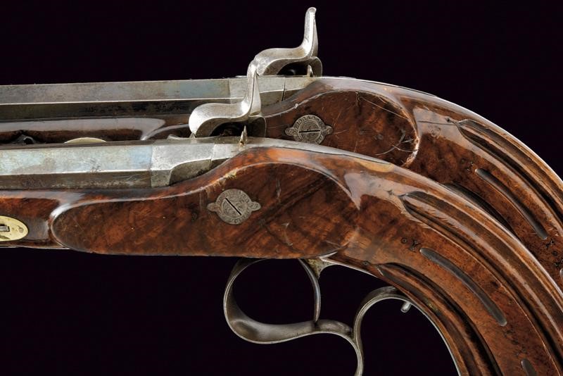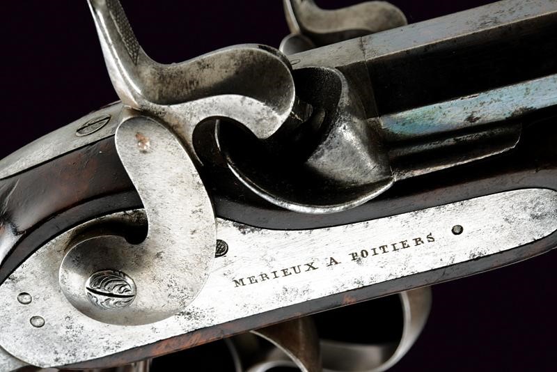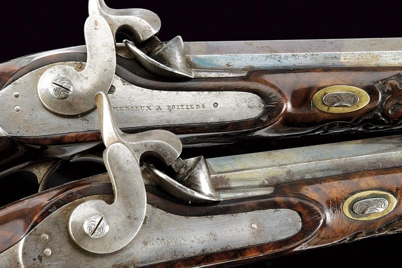 Long, octagonal, rifled and browned, 12 mm cal barrels (clean bore, clearly visible rifling), base with numbers "1" and "2", precision sight. Smooth, numbered tangs with sight. Spring locks with plate signed "MERIEUX A POITIERS". Wooden half stocks with floral-carved fore-end caps and butts with grooves following the curvature. Iron mounts, trigger guards with finger rests, butt plates ending with a spinning top. Working mechanism.