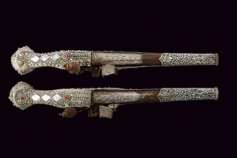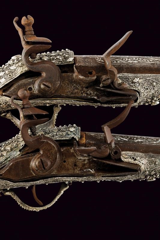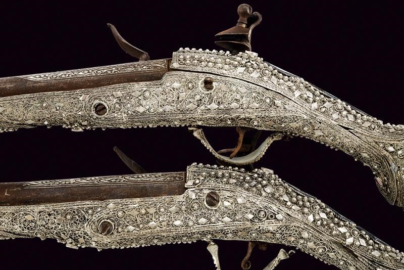 Round, smoothbore, 17 mm cal barrels with octagonal base, the first part with silver decorations depicting floral motifs; flintlocks (mechanism needs revision). Wooden stocks completely covered in silver foil (small missing parts) richly decorated in filigree, the back with three lozenge plates featuring nieloed decoration between two red cabochon stones. Embossed silver barrel brackets. Small defects and restored parts.