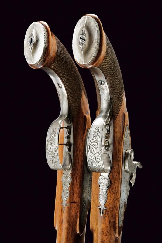 Rifled, octagonal, browned, 10 mm cal. barrels (clean bores, clearly visible rifling; one of the barrels is plugged at the centre, probably because of an un-ejected bullet), with rear sight and foresight. Engraved tangs with browned screw. Forward spring locks signed "I. C. HAUGGARD / KIÖBENHAVN" and engraved with floral motifs. Wooden, full stocks with elegant micro-checkered butts. Iron mounts decorated en suite. Set trigger. Horn-tipped wooden ramrods with iron bases.