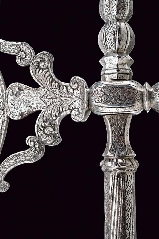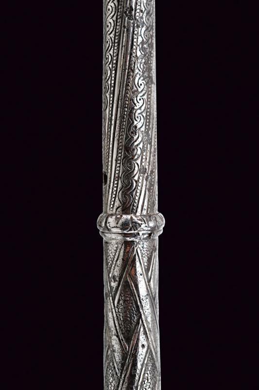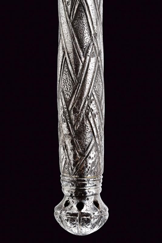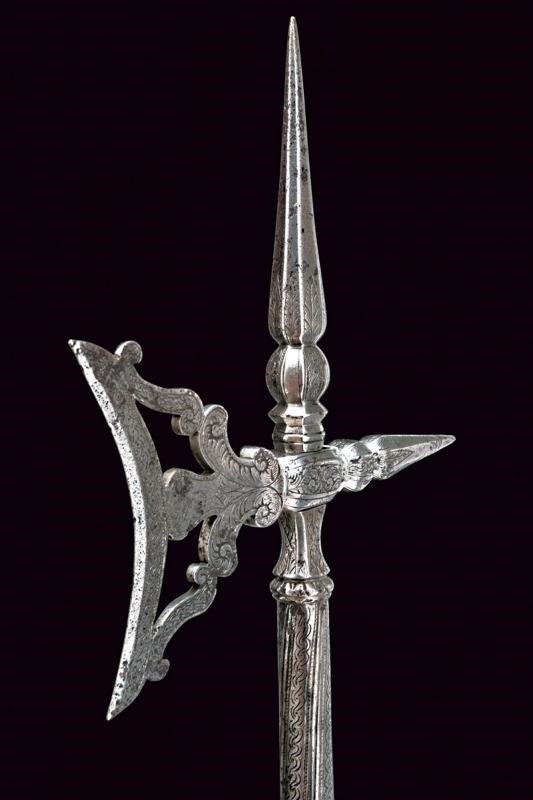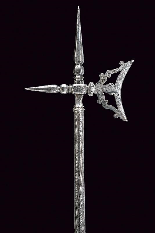 Pierced, carved and engraved, concave-edge axe. Straight, pointed beak with spherical base and engraved with floral motifs. Cusp worked en suite with the beak. Cylindrical shaft enlarging towards the base, richly engraved with bands at the top and with a weave on the long handle, ending in a carved and pierced pommel. Hole for the strap.