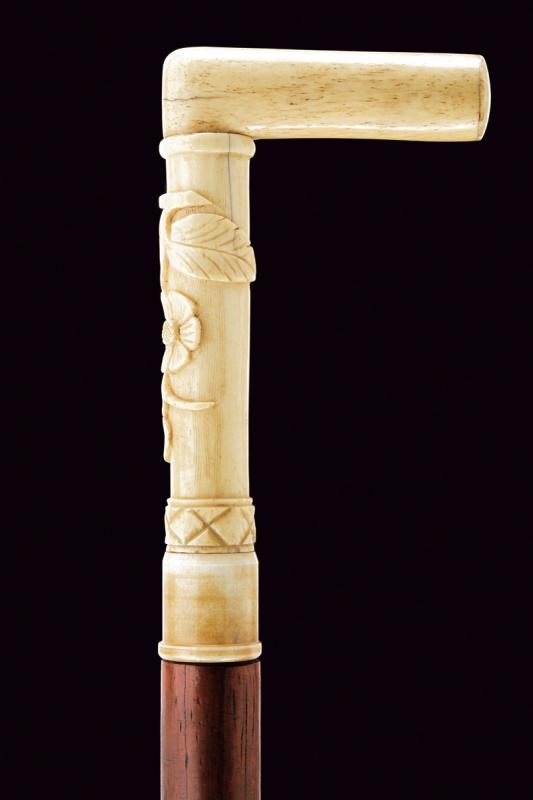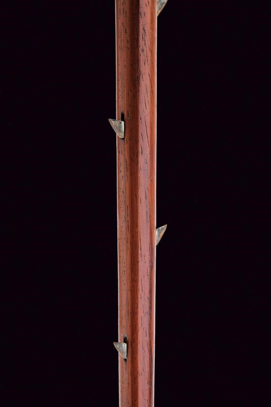 Grip made of deer horn elements, of angled shape, carved with fine floral motifs. Wooden shaft provided with foldaway blades or cusps coming out once the grip is pulled. Horn shoe (restored?). Rare.