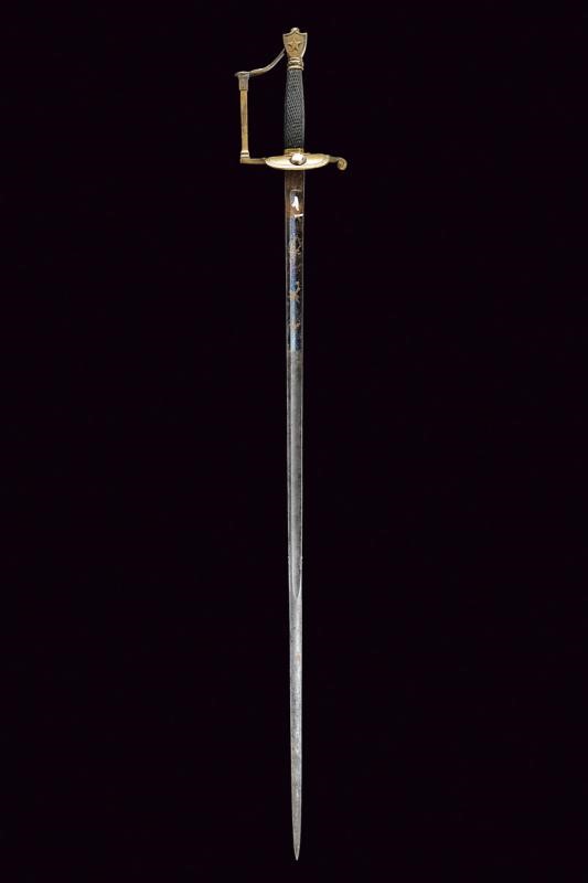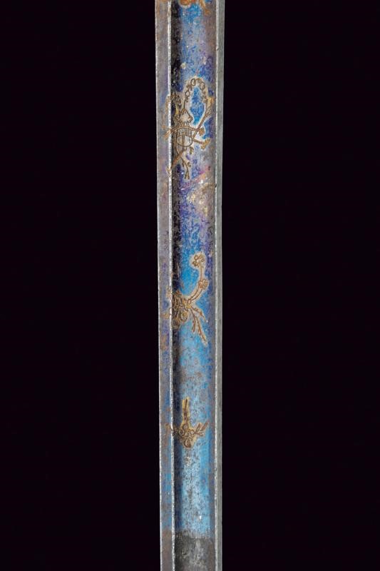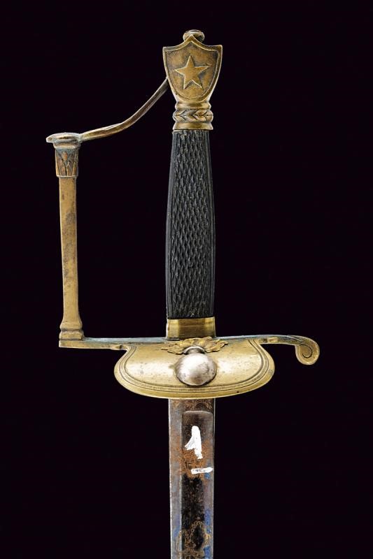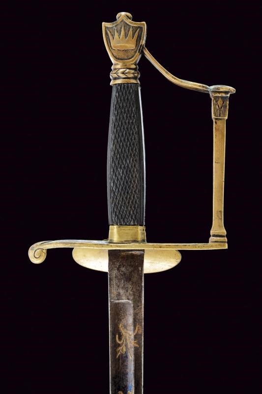 Straight, single-and third- edged blade, with fuller up to the beginning of the false edge, with remains of light-blue finishing at the forte, featuring small engraving depicting racemes with remains of gilding. Brass, Empire-style hilt with remains if silver-plating. A flaming grenade on the shell-guard. The guard decorated with architectural motifs. The pommel featuring a five-pointed crown on one side in relied, and another star on the opposite side. Knurled ebony handle. Without scabbard.