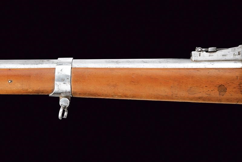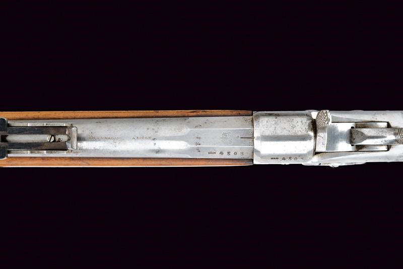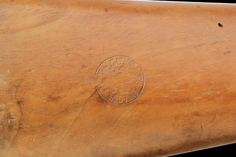 Round, rifled, 12 mm cal. barrel (slightly dusty bore, with visible rifling), octagonal base marked with pontifical mark, mark of the Liège test bench, serial number "45xx" and with other marks, a little further the mark "E. M. & L. NAGANT A LIEGE"; with foresight, clutch for the bayonet, foldaway and adjustable rear sight. Iron frame marked "BREVET REMINGTON", various marks including "X" and "S" under crown, serial number matching the barrel. Rolling block bolt with marks and serial number also matching the barrel. Working mechanism. Wooden butt and fore-end (a couple of woodworm holes on the butt), still visible on the right side of the butt stock, the stamp "CATHOLIQUES BELGES" with date "1868". Iron mounts and ramrod. Together with a yatagan bayonet (length 69.5 cm) with matching serial number, iron scabbard.
