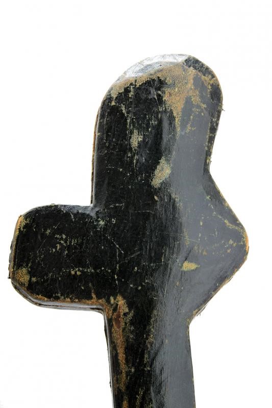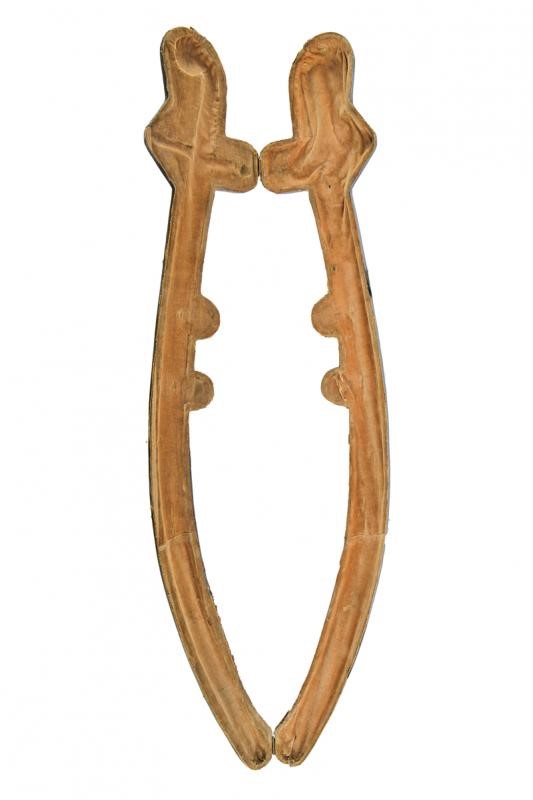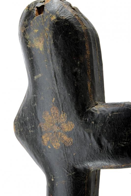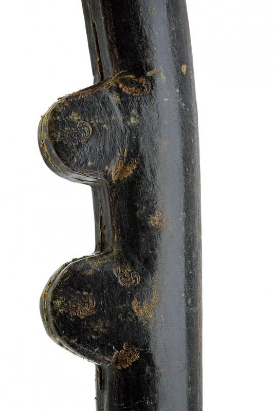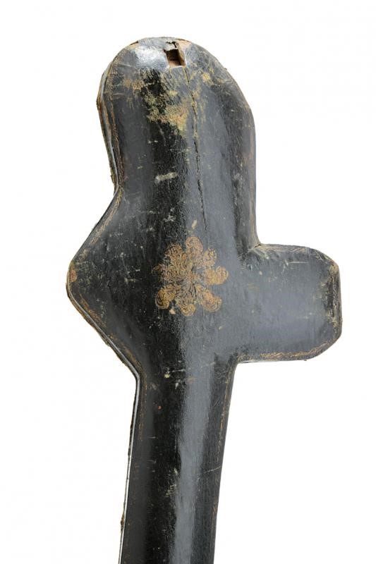 Made of wood covered in bottle-green leather decorated with gold floral motifs. Brown velvet-lined interior. Almost certainly manufactured to house an Oriental-style sabre. Signs of time and use. Rare.