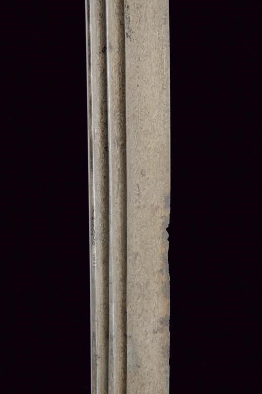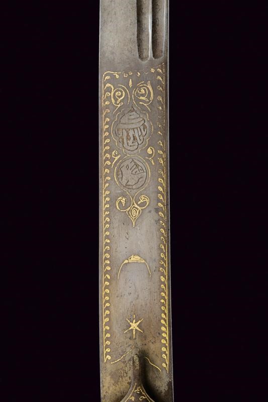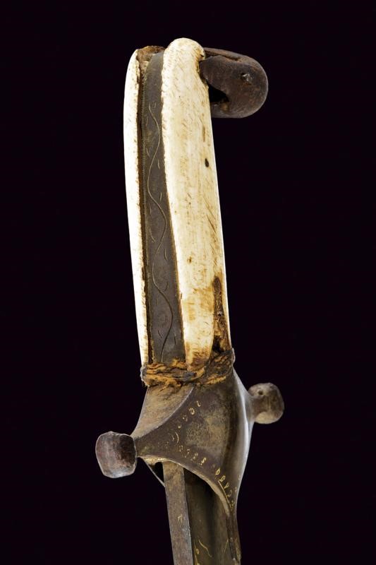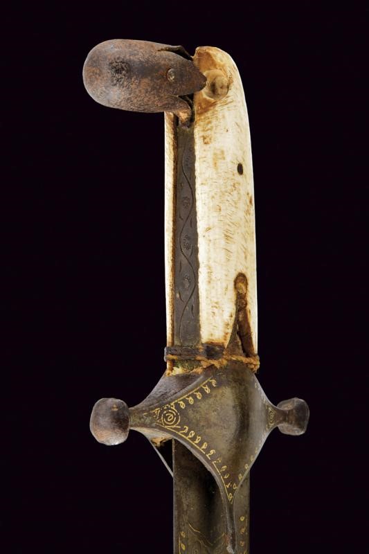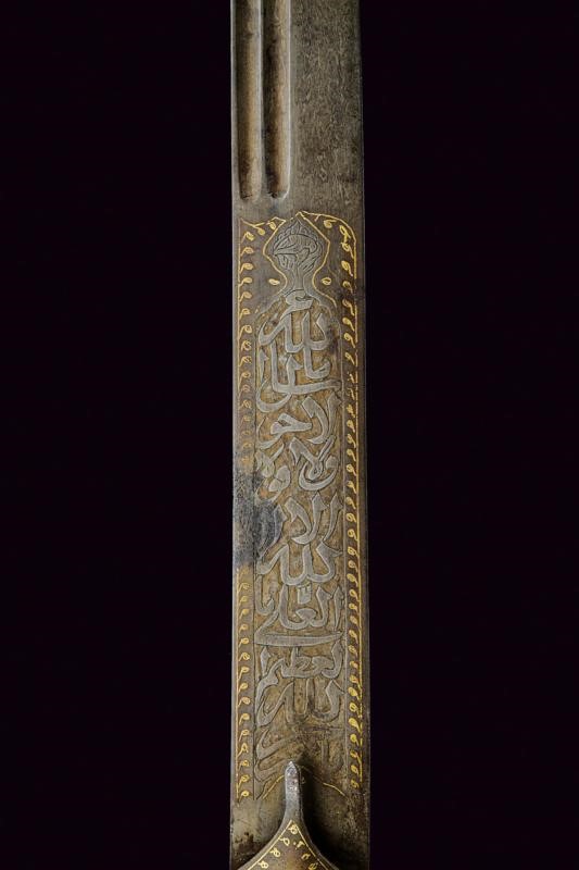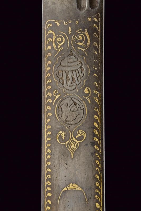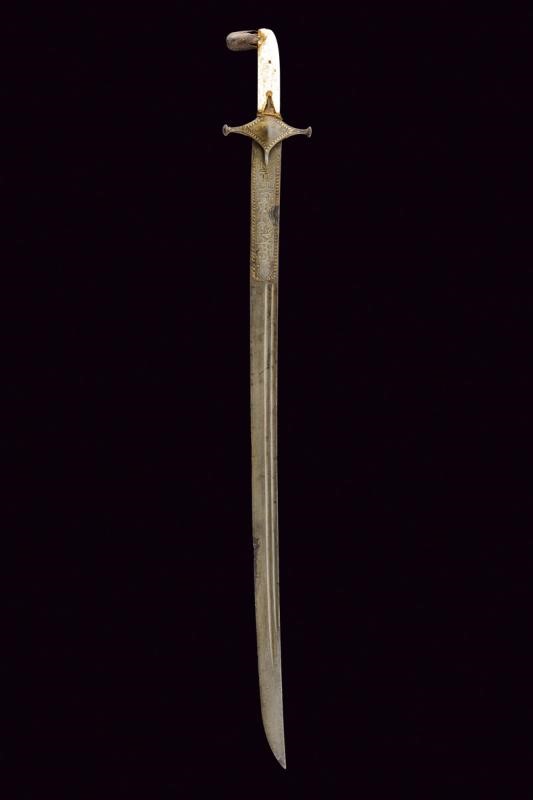 Straight, single-edged blade made of fine Wootz damask, with double fuller at the back. On one side of the tang the inscription "La hawla wa la quwwata illa Billah al layul azim" (There is no power and no strength except with Allah). On the other side, a cartouche with a stylised lion, typical of Assad Allah's production, all amidst gold-inlaid decorations and frames. Typical guard, probably made of damask, also with gold frames, pistol grip with camel bone grip scales. Minor damage.