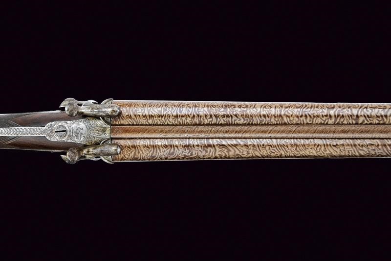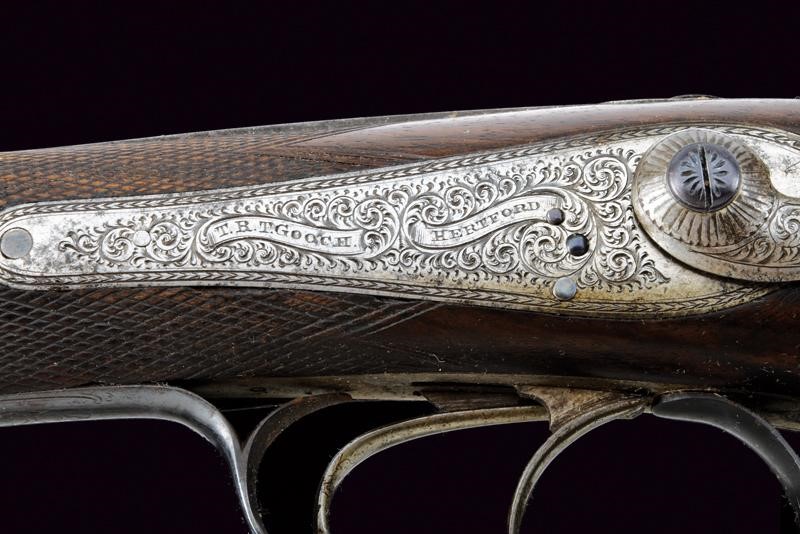 Round barrels, finishing with damascus pattern (probably refreshed), central rib with signature "GOOCH MAKER HERTFORD". Small, 16 mm caliber at the nozzle, probably 20 gauge. Bore in good condition with small signs of use. Marks of the London test bench. Receiver engraved with racemes and hounds. Backward spring locks engraved with racemes and signed "T.R.T. GOOCH HERTFORD". Wooden butt and fore-end with checkered segments. Butt plate partially made of iron, with pitting. Trigger guard and opening lever with remains of browning. Well working mechanism.