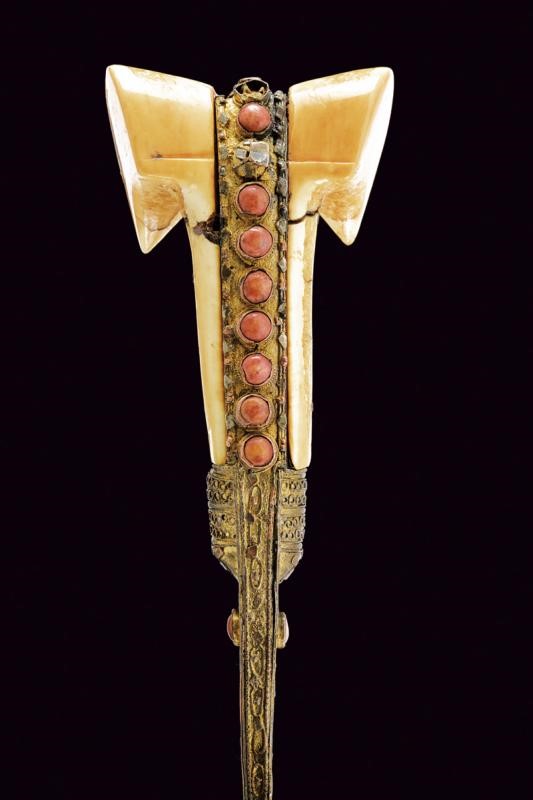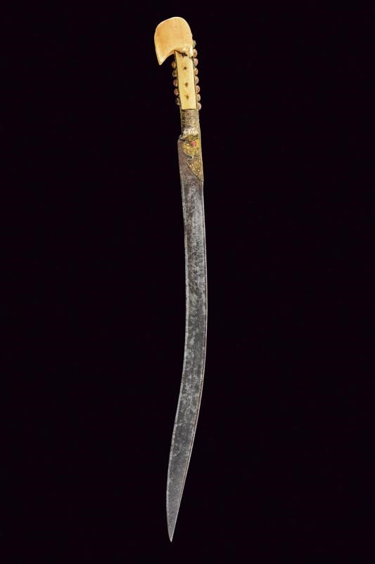 Long, curved, single-edged blade with dorsal groove Copper hilt with remains of gilding decorated in filigree and with red cabochon stones (small missing parts). Walrus tooth grips with large ears (restored parts).
