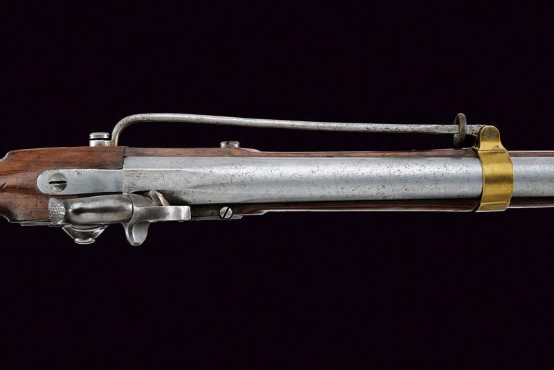 Smoothbore, round, 18 mm cal. barrel, with octagonal breech. Smooth tang. Forward spring percussion lock with flat lock plate marked "AL", tang with date "1846" and number "3", with safety lock. Working mechanism. Wooden, full stock with brass and iron mounts. Long shaft with saddle ring. Articulated, iron ramrod.