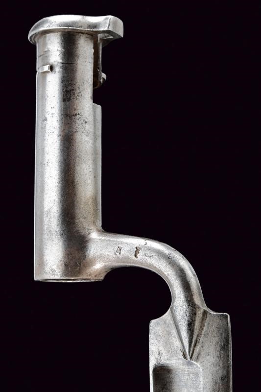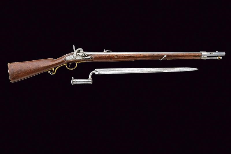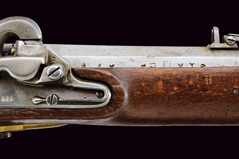 Round, rifled, 18 mm cal barrel (12 clearly visible rifling) with octagonal base marked "CP", "11 C 3 9", "IA" under eagle, and various marks and symbols including the Greek letter omega on the right side, and "854" on the left side; provided with foldaway rear sight, front sight, clutch for the bayonet. Lock with Augustin system, plate dated "853" and with imperial mark. Wooden full stock, brass trigger guard and butt plate (tang marked en suite with the barrel), iron ramrod with brass ring. Complete with its bayonet featuring marks, length: 71.8 cm [cm].