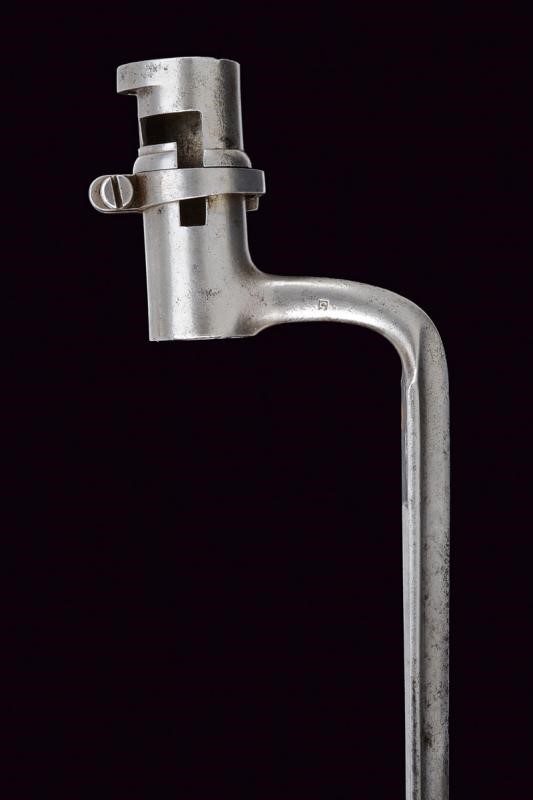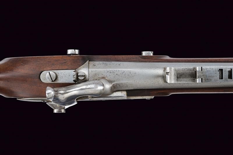 Round, rifled, 18 mm cal. barrel (bore with slight pitting, clearly visible rifling) with octagonal breech marked "GP 186..", with foldaway rear sight, clutch for the bayonet and foresight. Tang with rear sight. Percussion, forward spring lock marked "TORINO / 1862". Wooden, full stock with factory stamp of Torino 1862. On the left side of the side is mounted, in recent times, a shield with the inscription "FUCILE DA FANTERIA Mod. 1860 con alzo TORINO 1862". Iron mounts and ramrod. White leather strap from modern times. Complete with its 47.5 cm bayonet.
