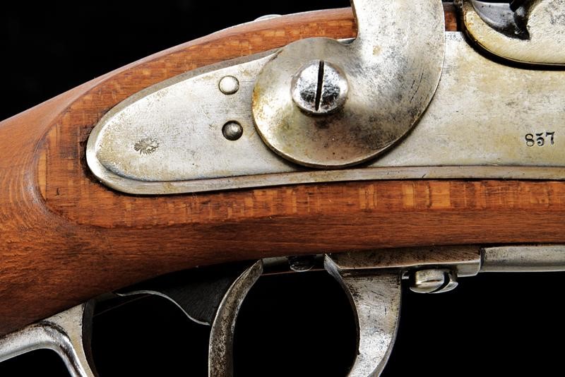 Round, rifled, 13,9 mm cal. barrel (clean bore, visible rifling) with octagonal base marked "WANZEL", "W", imperial mark and other marks on the left side; with foldaway rear sight (900 feet), foresight. Forward spring lock with Austrian imperial mark and date "857". Working mechanism. Wooden, full stock with mark. Iron mounts, ramrod and socket bayonet (length 56 [cm]).