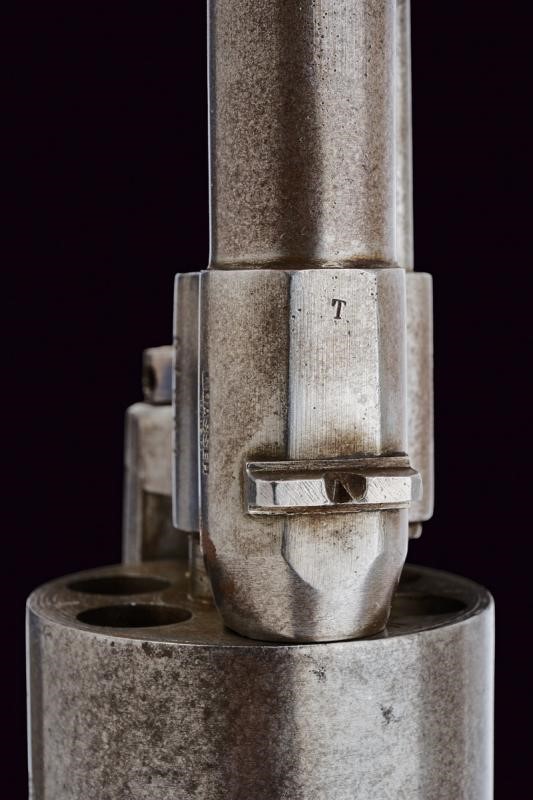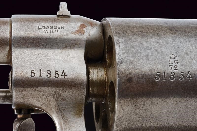 Cylindrical, rifled, 11 mm cal barrel (clean bore, visible rifling), provided with front sight and fore-end, with mark "T" at the base and "L.GASSER / WIEN". Six-shot cylinder with crowned mark "LG 72" (for the year?). Working mechanism. Frame with non-legible marking "T7.Lst.B. / 29" (probably department numbers). Hammer with remains of bluing. Handle with knurked, wooden grips. Ring for the strap.