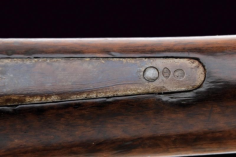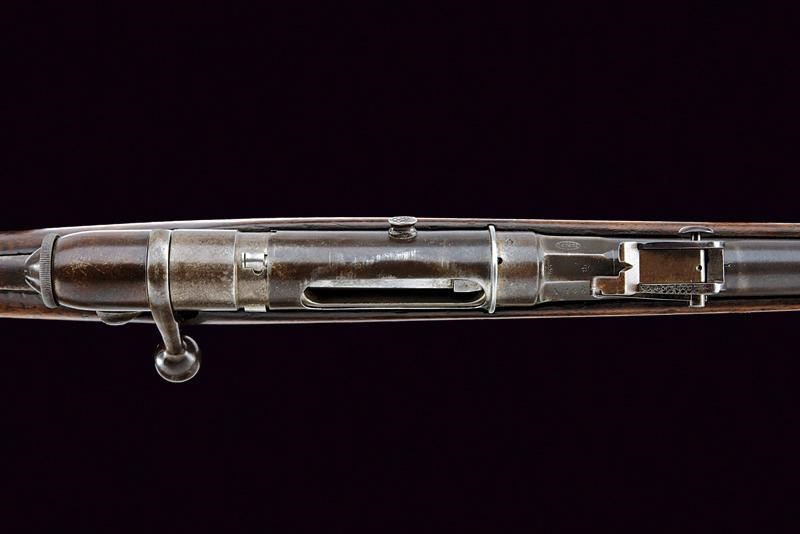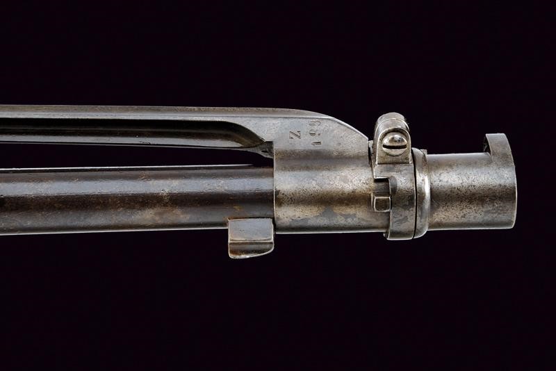 Rifled, round, 10 mm cal. barrel (clean bore, clearly visible rifling), with foresight and adjustable rear sight, marked and with mark "TORINO", date "1873" with serial number "A 14xx"; sliding-revolving bolt with covering. Wooden, half stock, the butt marked with the same serial number; steel mounts. Butt plate with loading gate, inside folding ramrod. Complete with socket bayonet, crossbar blade marked "Z 199" and with mark.
