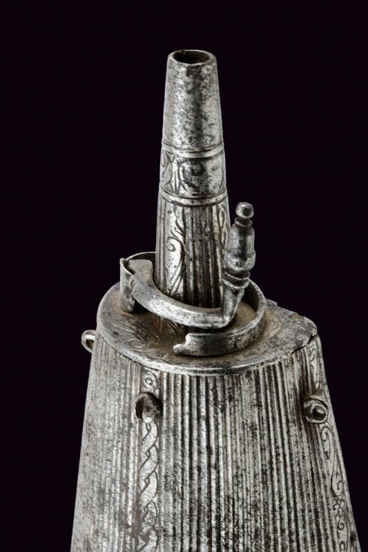 Body shaped as a truncated cone, flat on the back, decorated with longitudinal grooves in a thousand lines with three floral engraved staves on the front side. The side of the fuse engraved en suite with the staves. The base of the fuse shaped as a truncated cone, worked like the magazine. Closure with screw and hinge. Four suspension rings.