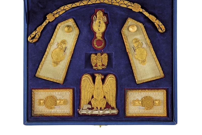 All facings for hat and uniform, complete with shoulder boards, flashes, eagle for fez, cord; all elements in gilded threads, one marked "GIL". In their original box (small defects) made of blue morocco with gilded borders and fasces in the centre of the lid. The interior covered with blue velvet, gold stamping of the manufacture "CARLO BASSANO / VIA CARLO ALBERTO N.21 / TORINO" inside the lid .