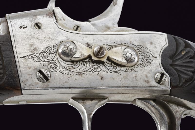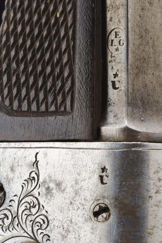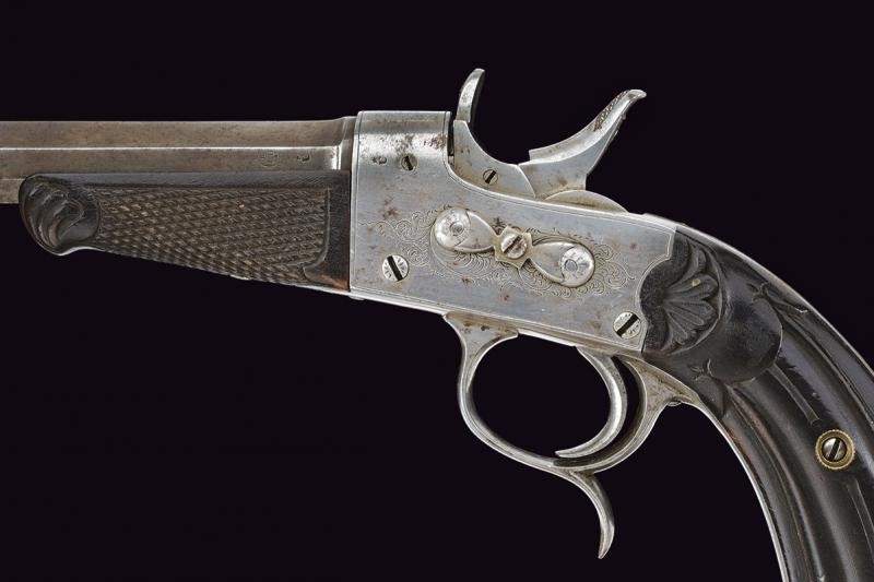 A rifled, 9 mm cal. barrel with eight faces of different areas, the base marked with "U " under star and with mark of the Liegi test bench, provided with foresight. Frame engraved with racemes and provided with a rolling block bolt. Grooved butt (the signature "G. DECORTIS" under the left grip scale) and checkered fore-end with fore-end cap sculpted as a shell. Iron mounts, trigger guard with finger support. Ring for the strap.