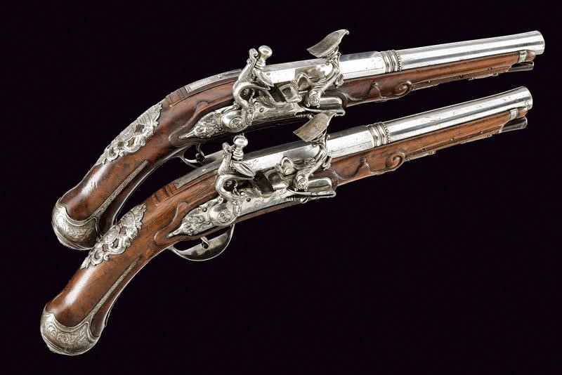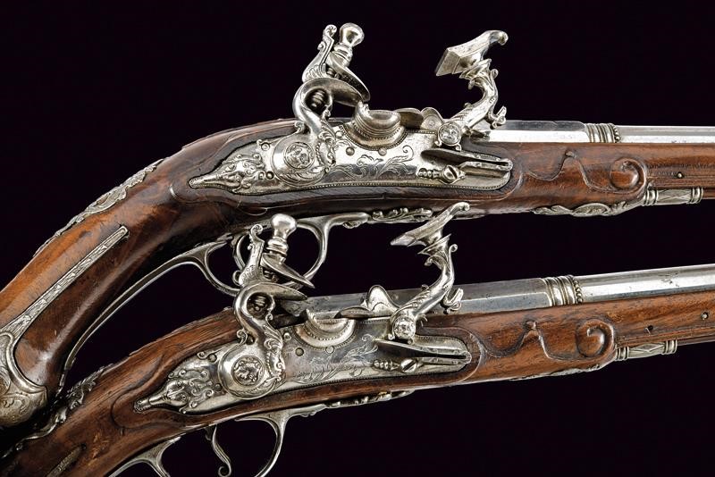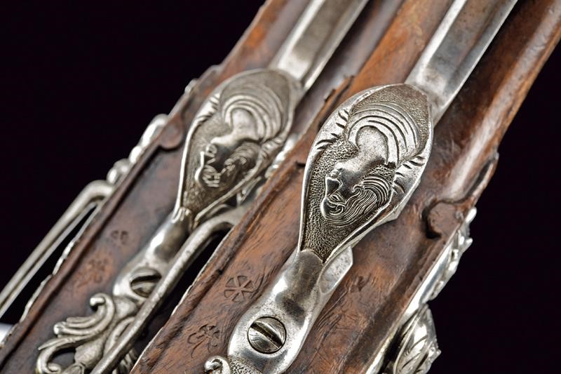 Smoothbore, two-stage, 11 mm cal. barrels, octagonal at the first part engraved with floral motifs at the base, then round after smooth and beaded rings; engraved tangs. Beautiful locks richly carved and engraved with many masks, snake and floral motifs, provided with sliding pan cover. Slightly sculpted wooden full stocks with partially pierced steel mounts, carved and engraved with busts and floral motifs. Belt hooks. Horn-tipped wooden ramrods with iron cartridge extractors.