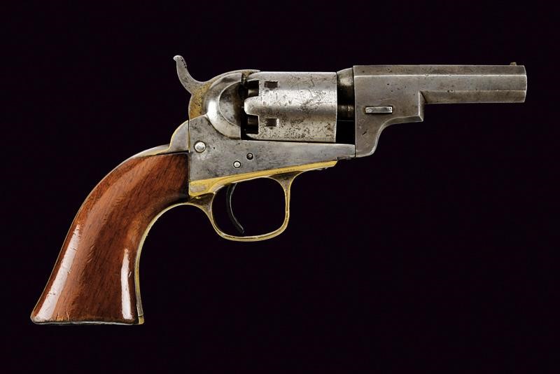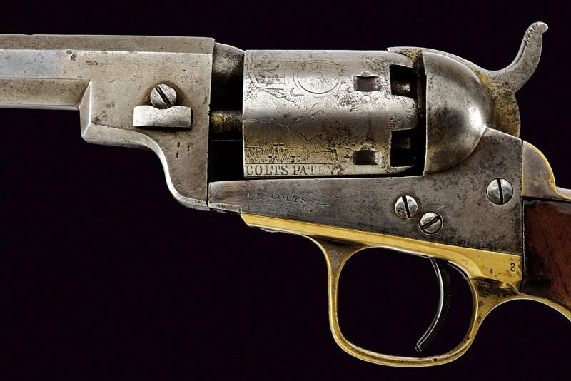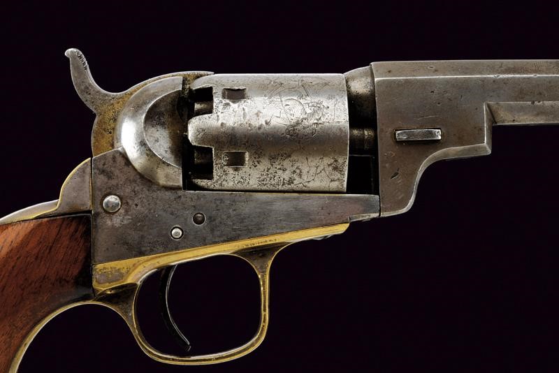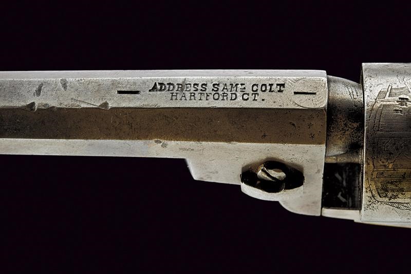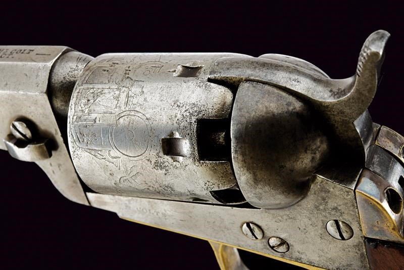 Short, octagonal, 3', 31 cal. barrel (several pitting and fouling inside, visible rifling), "Baby Dragoon" type, with round, brass foresight, two-line mark “ADDRESS SAM.L COLT / HARTFORD CT.” Matching serial number to the frame. Barrel wedge without spring and with matching partial serial number. Six-shot cylinder with partially visible stagecoach holdup scene, "COLTS PATENT" mark and matching serial number to the frame. "Long frame" type frame with remains of “COLTS PATENT” mark, serial number “194xxx”. Cylinder pin with matching partial serial number. Brass grip straps with remains of silvering. Serial numbers en suite. Very wide trigger guard. Some pitting especially to the cylinder. Walnut grip.