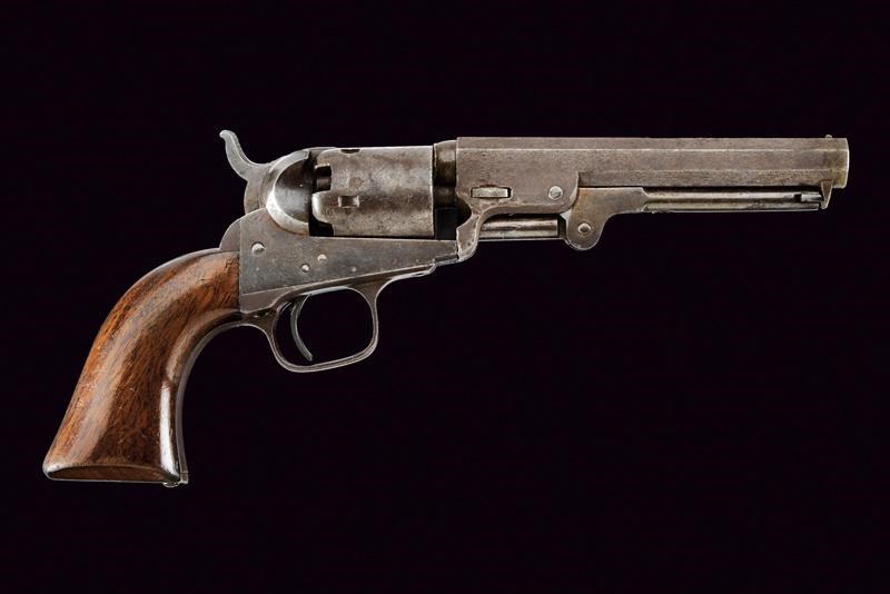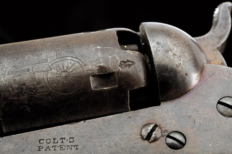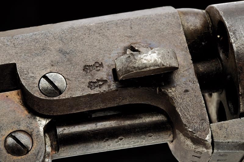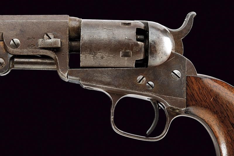 Octagonal, 5', rifled, 31 cal. barrel, with low circular brass foresight, (visible rifling, slight pitting), featuring dorsal two-line mark in curly brackets "ADDRESS COL. COLT / LONDON". Some filing to the breech. Serial number on the barrel, cartridge rammer and barrel wedge, matching to the frame. Mark of the London test bench. Five-shot cylinder with remains of stagecoach holdup scene, visible "COLTS PATENT" and matching serial number. Frame with "COLTS PATENT", serial number “13xx”. Working mechanism. Typical iron grip straps of London manufacture, with matching serial numbers. Some pitting. Walnut grip.