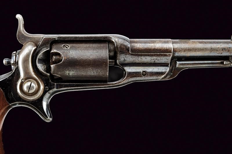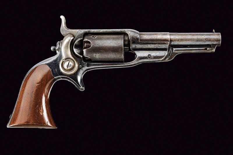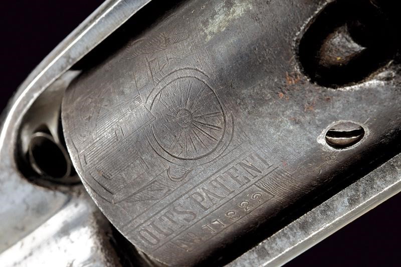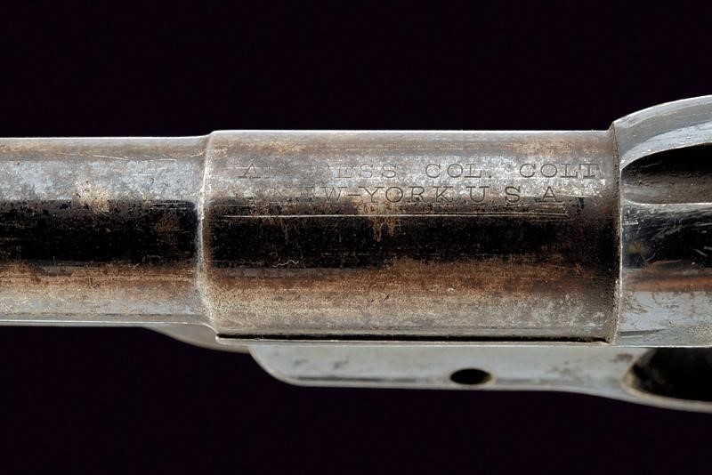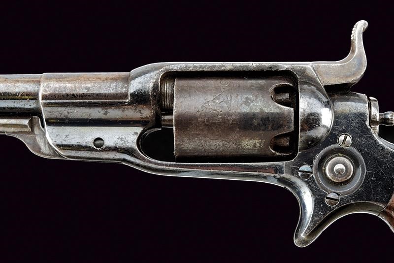 Round, 3-1/2’, 31 cal. barrel (visible rifling, bore needs cleaning) with brass, cusped foresight, with remains of “ADDRESS COL COLT / NEW-YOTK U.S.A.” mark. Smooth, five-shot cylinder with remains of stagecoach holdup, "COLTS PATENT" mark and matching serial number to the frame. Frame with spur trigger. Working mechanism. Serial number "11xxx". Walnut grip. Well preserved, with approx. 70% of antique browning. Seventh Model.