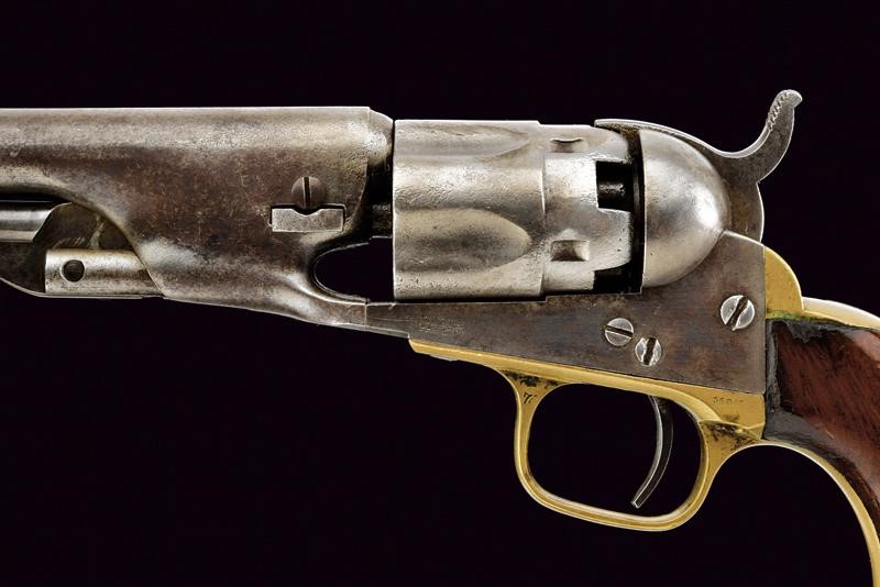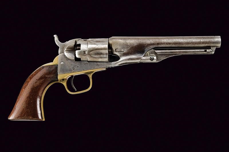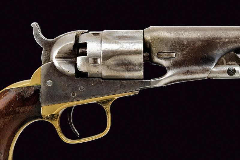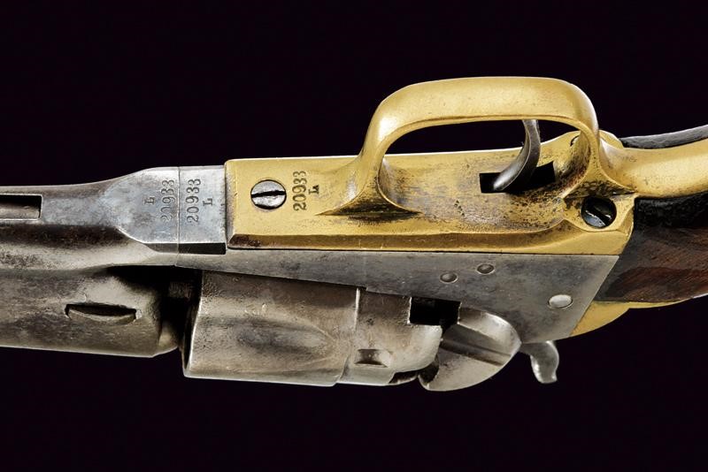 Rifled, round, 5-1/2’, 36 cal. barrel (bore needs cleaning, visible rifling) with standard dorsal mark, brass conical foresight. Frame with matching serial number and stamp "L", barrel wedge with partial serial number (matching). Five-shot, fluted and rebated cylinder with remains of patent mark. Working mechanism. Frame marked "COLTS PATENT", with serial number "20xxx" and stamp "L". Cylinder pin with matching partial serial number. Brass grip straps both with matching numbering and same stamp. The frame with small remains of finishing . Remains of browning under the barrel. Some parts with pitting. Smooth walnut grip.