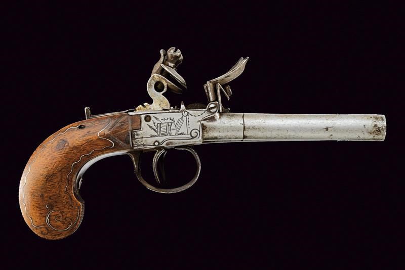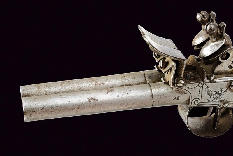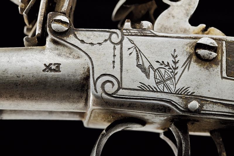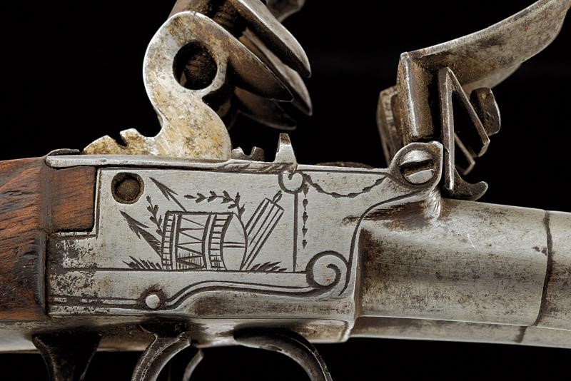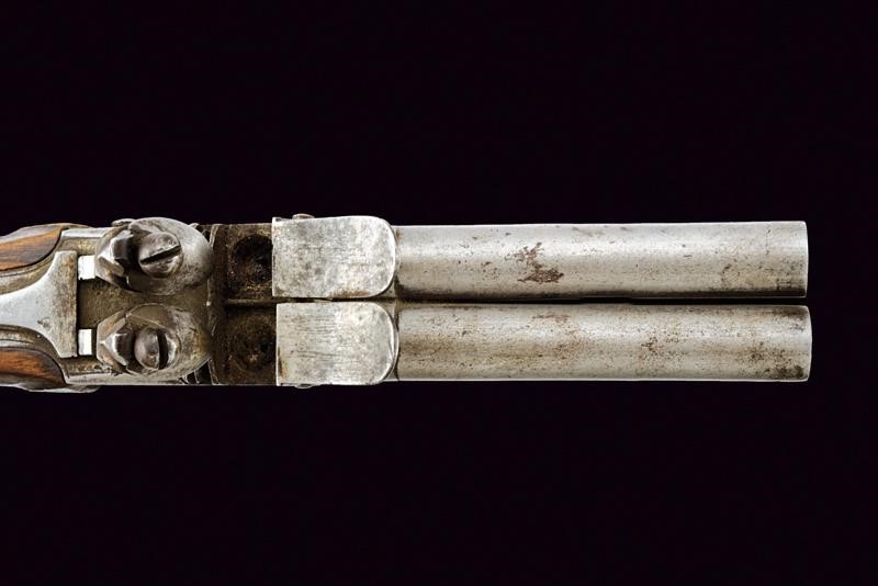 Smoothbore, round, turn-off (locked), 10 mm cal. barrels, one marked "EX" at the base. Boxlock type frame engraved with trophies. Upper cock with safety lock, double trigger, engraved trigger guard. Wooden butt decorated in filigree and with checkered border. The two springs need to be replaced.