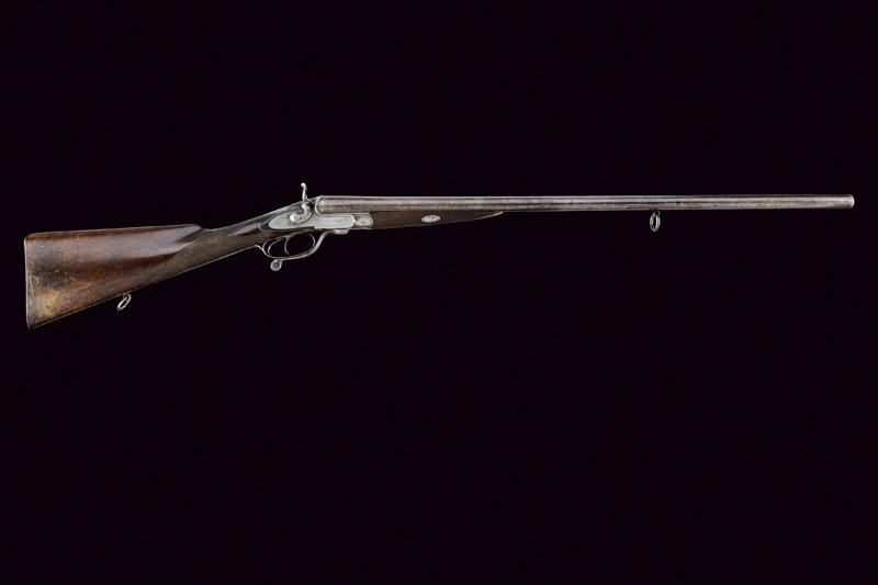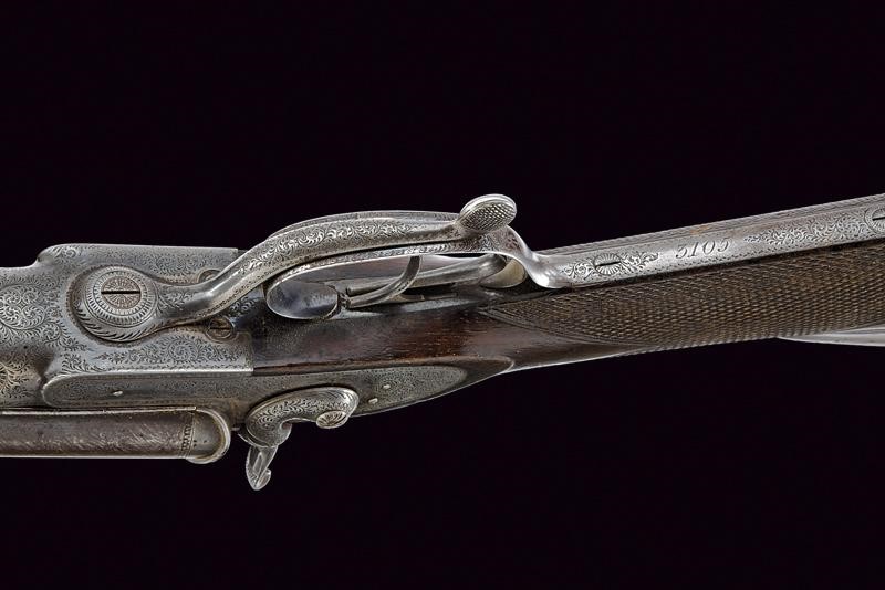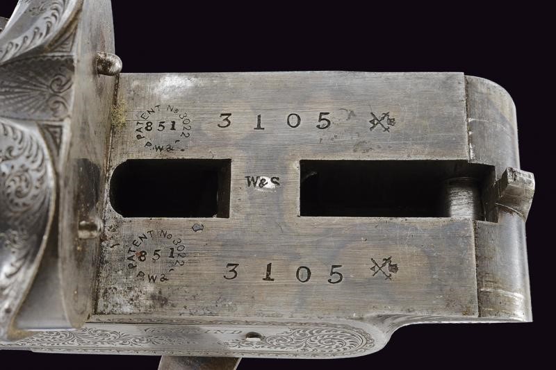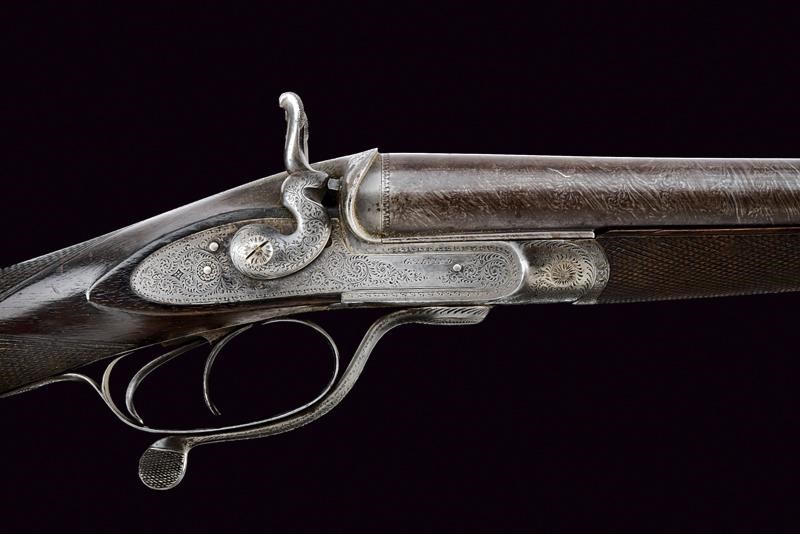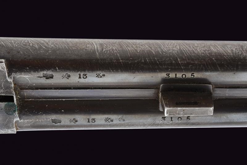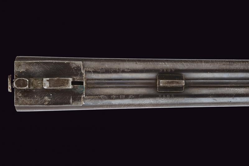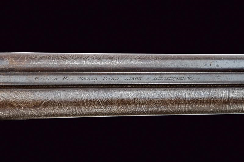 Smoothbore, round, 12 cal barrels (small signs of use and some pitting inside), made of damask (a couple of slight bumps outside), provided with rib featuring white metal foresight and signed "GALAND GUN MAKER PARIS LIEGE & BIRMINGHAM". A small decoration engraved with racemes at the breech. Mark of the Birmingham test bench on the lower part. Remains of antique browning. Iron receiver, marked "W&S", with patent mark and other marks. Featuring fine raceme engraving. Forward spring locks engraved en suite, both signed "GALAND", with traces of browning. Cocks with two snaps. Working mechanism. Walnut butt and fore-end with checkered segments. Mounts engraved en suite. Key with opening lever in front of trigger guard. It deserves a proper restoration.
