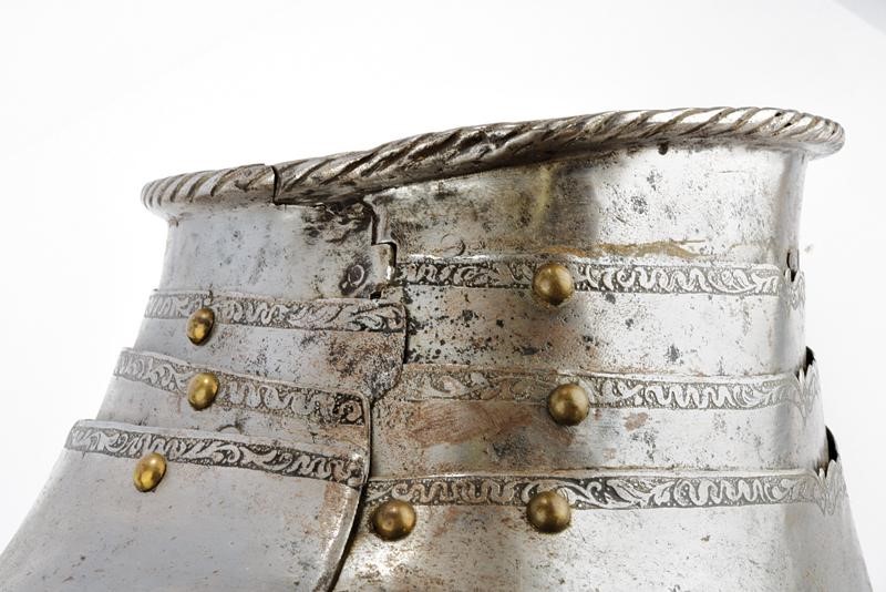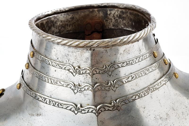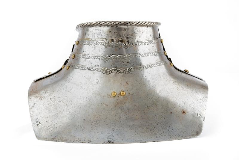 Made of iron, neck-plate with hemmed and twisted border; three plates with carvings in the centre and decorated with a band at the top with floral motifs on a dark granulated background. The last plate is thicker, the front one with fixing holes and a threaded clutch of later date in the centre. Closure on the right side. Very minor damage or missing parts. The interior with clearly visible hammer marks; small restorations.