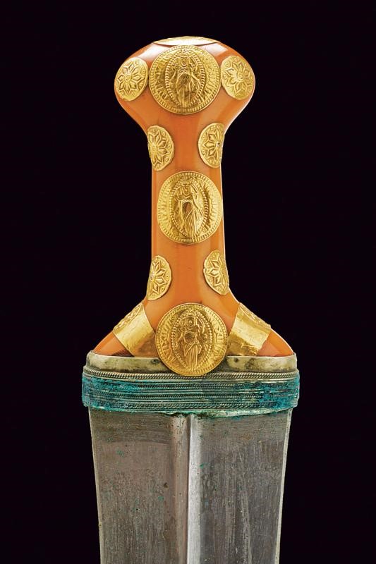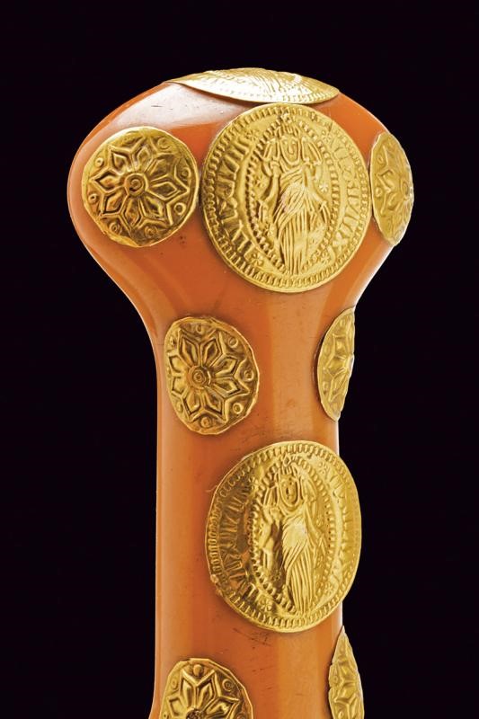Wide, curved, double-edged blade with central rib. Grip of typical shape made of fake amber, with gold (18 ct) and silver mounts. Leather-covered wooden scabbard decorated with imprints.