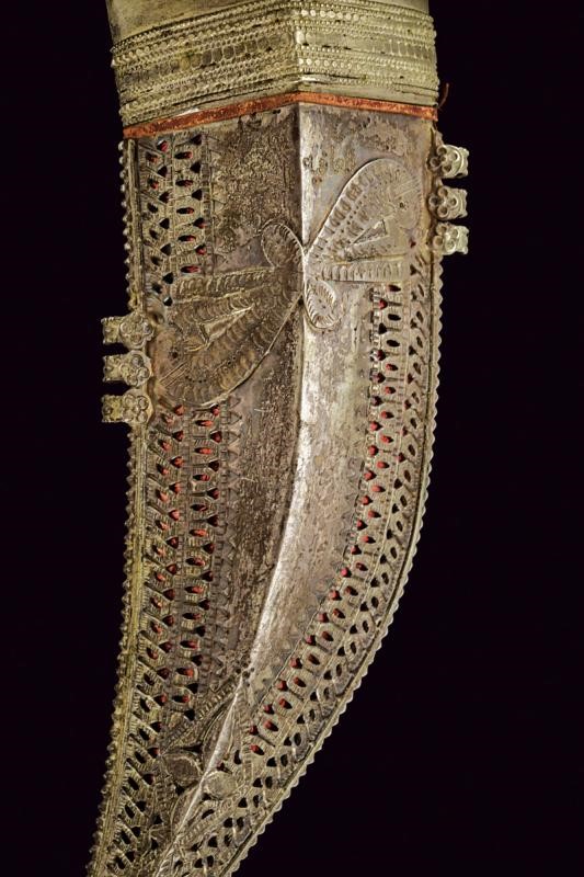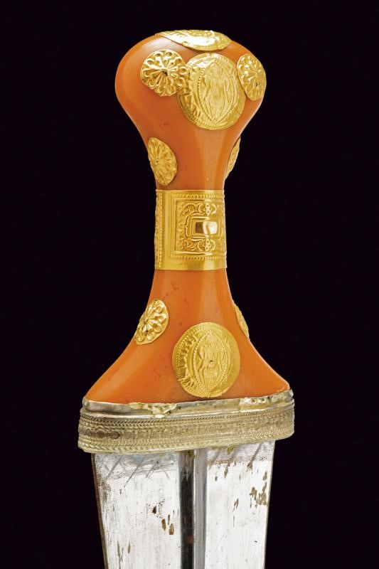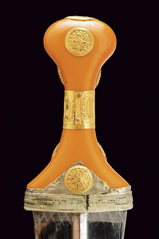 Wide, curved, double-edged blade, with central rib. Grip of typical shape, made of fake amber, with gold (18 ct) and silver mounts. Fine wooden scabbard covered in silver foil richly engraved, pierced and inscribed in Arabic. Six suspension rings. Leather back.