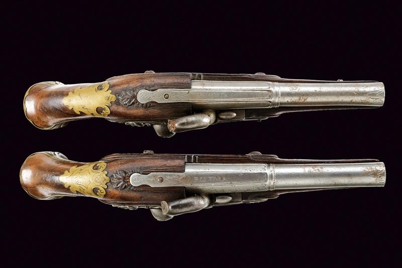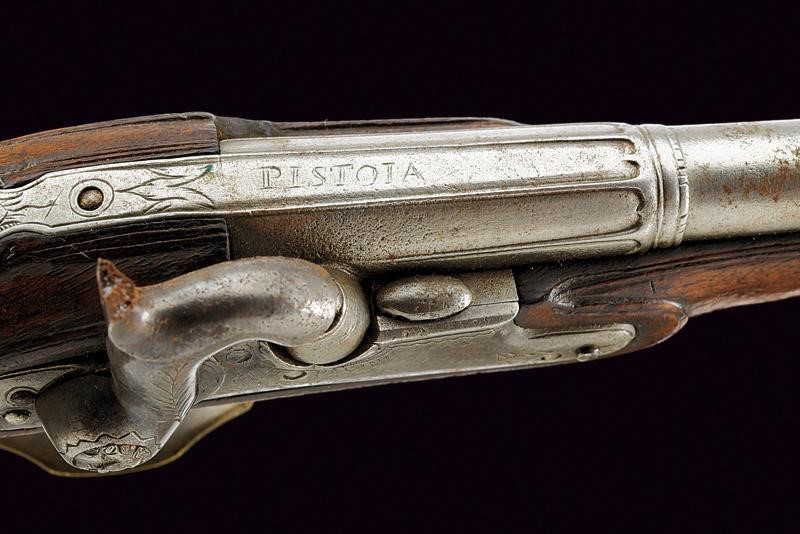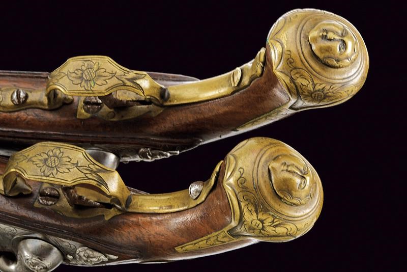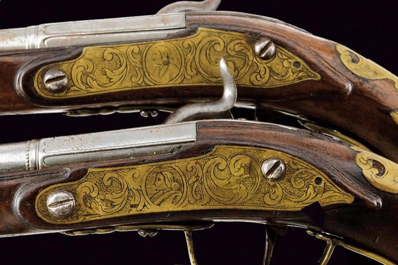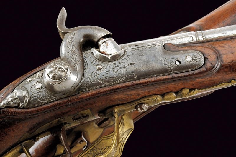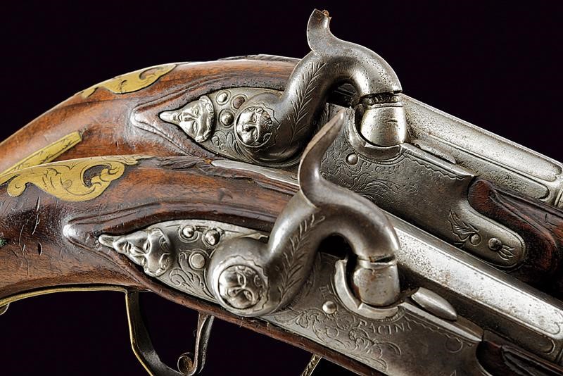 Smoothbore, two-stage, 10 mm cal. barrels, the first part decorated with grooves and marked "PISTOIA" in the central segment, after rings at the girdle with a section that becomes smaller in the second half, the nozzles decorated with an engraving. Engraved tangs. Locks converted to percussion, with slightly rounded lock plates finely engraved with floral motifs and winged figures, signed "IL PACINI" (damage to one of the cock), in the tangs and in the cock screw, beautiful anthropomorphic faces in relief. Wooden stocks (small missing parts) slightly carved at the tang. Brass mounts, butt-plates and trigger guards engraved with floral motifs, the butt-plates also with mask in relief, interesting counterplates fully engraved with floral motifs and with female figure in oval frame, the backs with wide shield. Wooden ramrods.