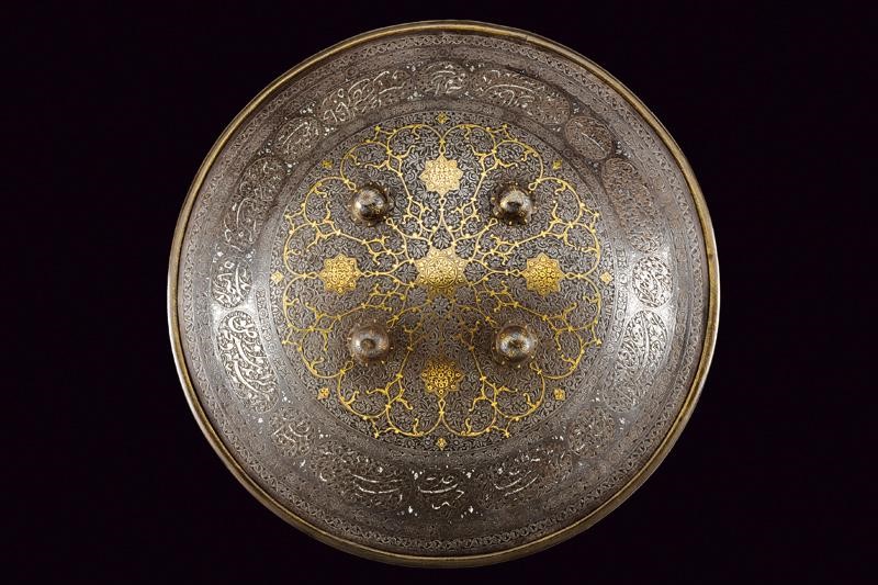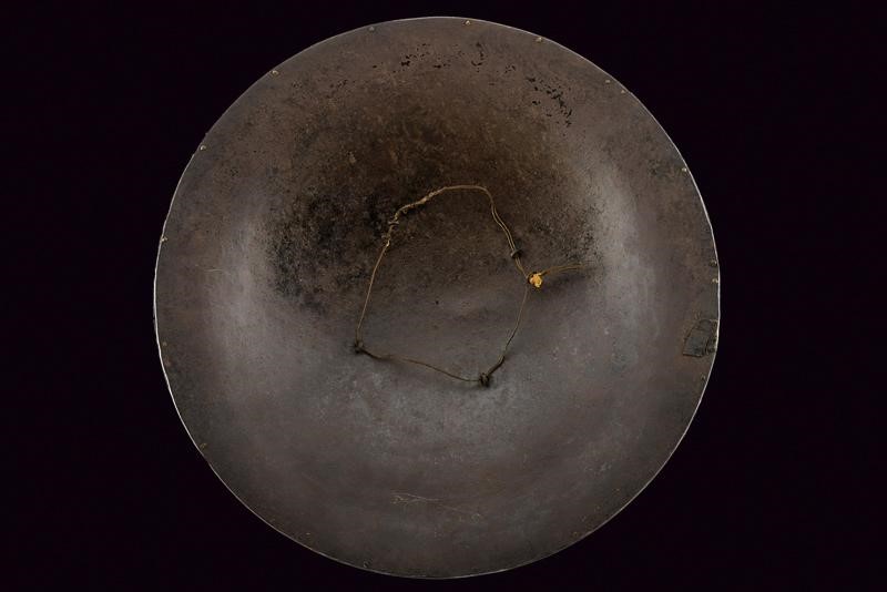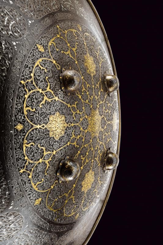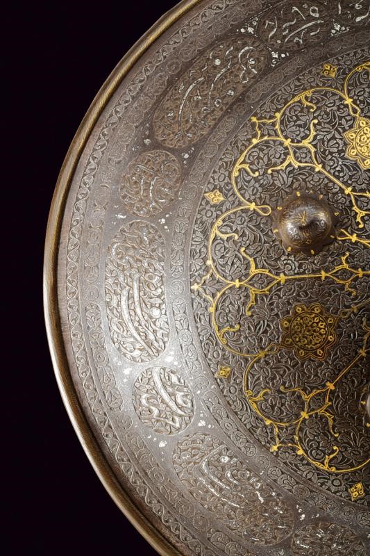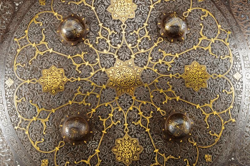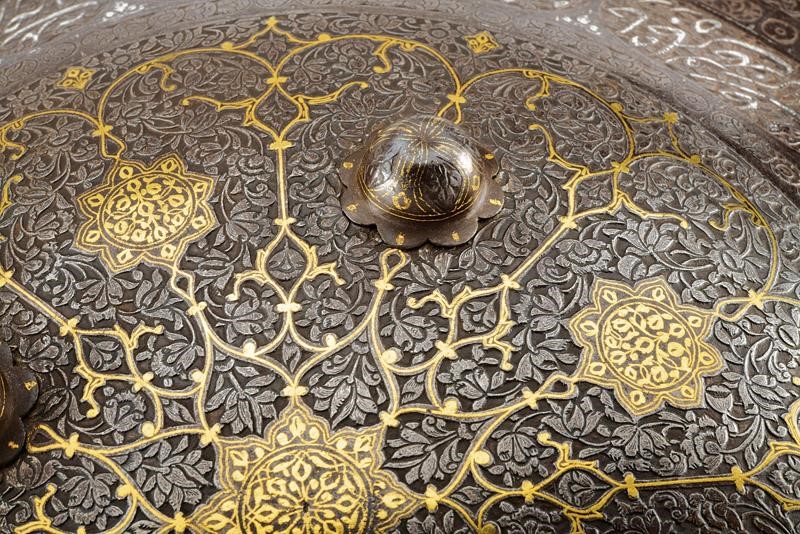 Made of iron, of convex and round shape, provided with four flower-shaped studs with remains of gilding and border in relief. The entire surface finely engraved with geometric and floral motifs on a dark background. In the centre, a circular ring with concentrically symmetrical branches, all gold-inlaid; at the border remains of silver inlays. On the rear side four rings for the handles (missing).