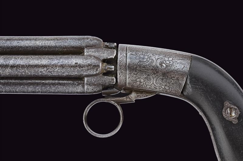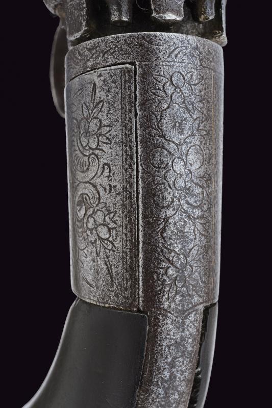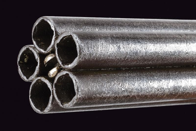 Cylindrical, smoothbore, turn-off, 9 mm cal. barrels made of damask (pitting inside). Rolling block with pistons in line with the barrels, remains of numbering. Rolling block with mechanism which needs revision. Cylindrical frame with remains of engraved floral motifs. Ring trigger and firing pin on the lower side, working. Remains of Mariette marking on the central grip band. Pitting on iron parts and signs of time. Ebony grip scales.
