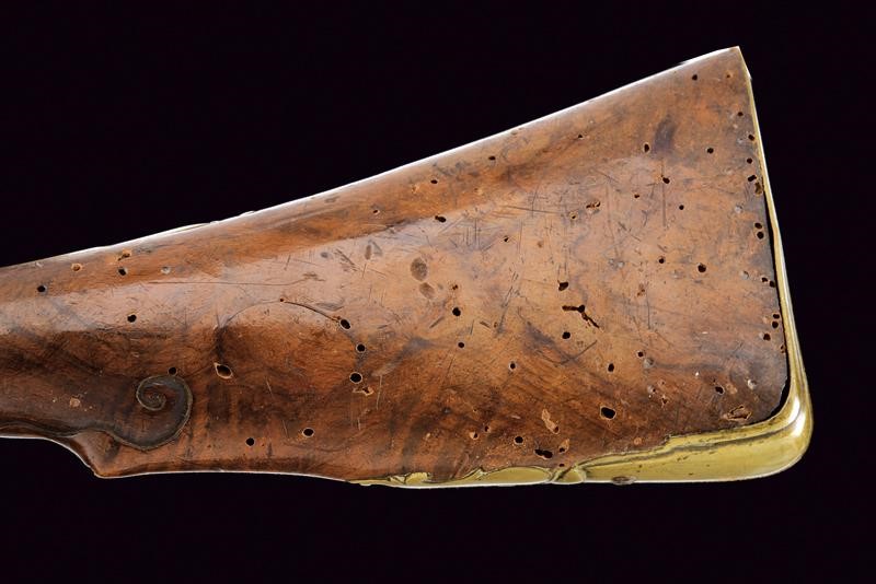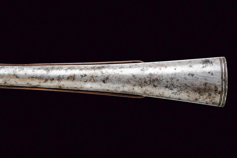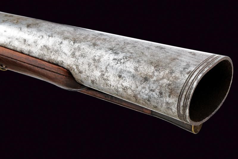 Smoothbore, two-stage barrel, octagonal at the first part then round after rings, the nozzle elliptically bell-mouthed and decorated with rings. Flintlock with flat lock plate and signed "FRANCESCO ROSSI"; tang with transversal groove. Wooden full stock (numerous woodworm holes) with brass mounts, opening button on the back. Wooden ramrod with iron cartridge extractors.