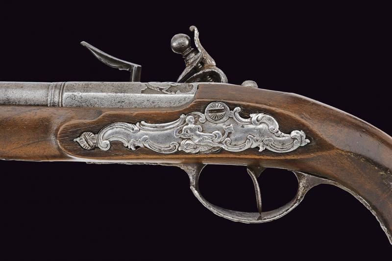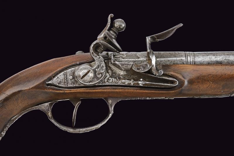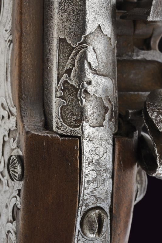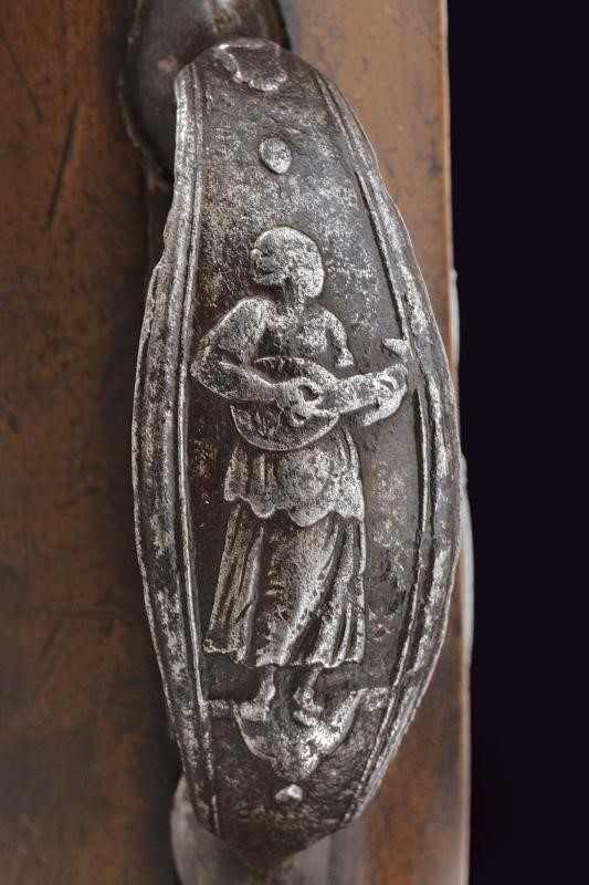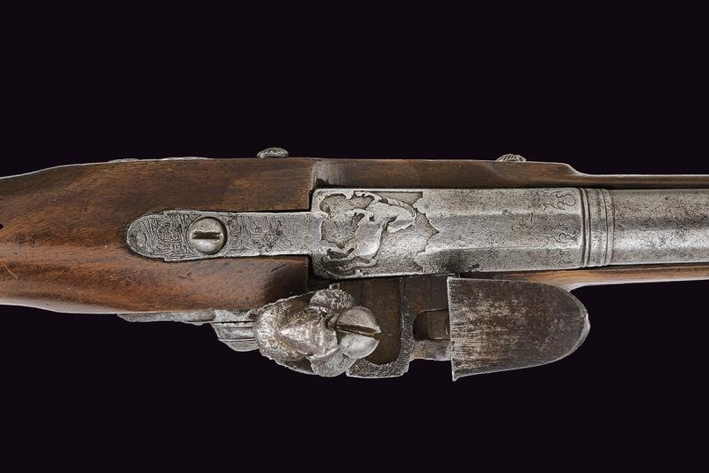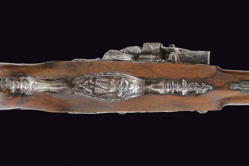 Smoothbore, two-stage barrel, the first segment octagonal with fine carving depicting a horse at the base, before the girdle engraved with geometric motifs; at the girdle two rings, then round; 11, 5 mm cal. at the nozzle. Flintlock with central carving representing a triton; internally marked "GB". Wooden full stock. Interesting carved iron mounts, with a mermaid at the counterplate, a musician at the trigger guard and warriors with lance at the butt-plate. Iron ramrod.