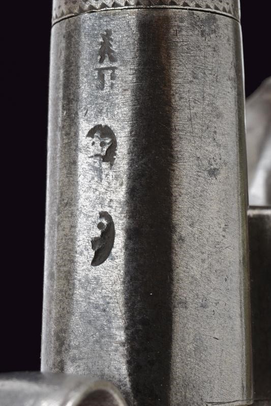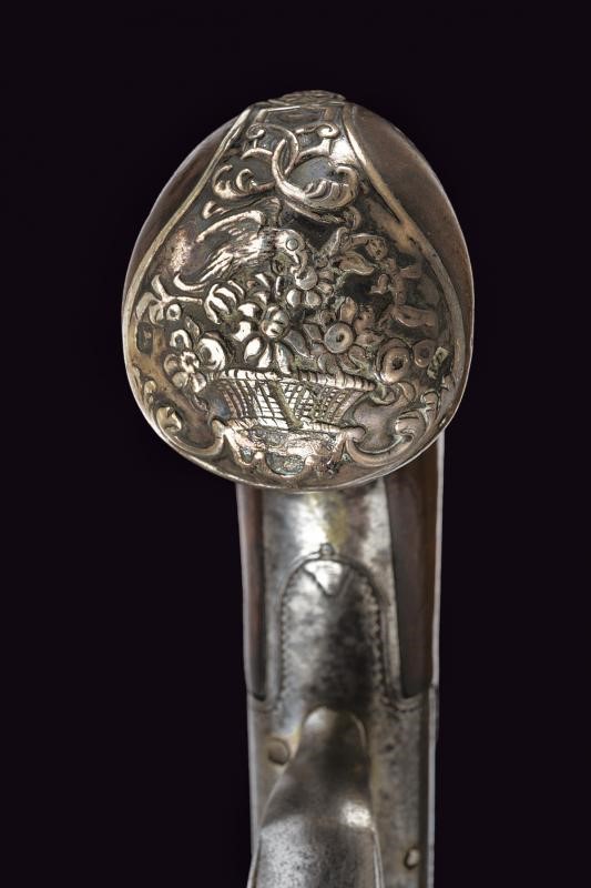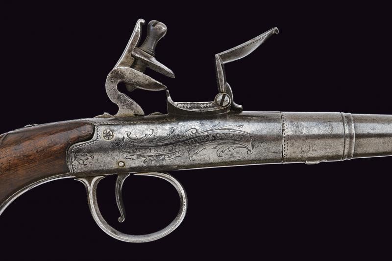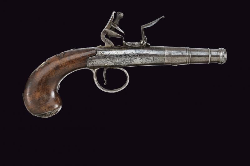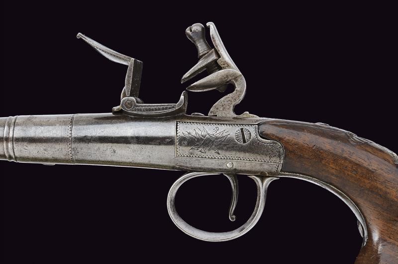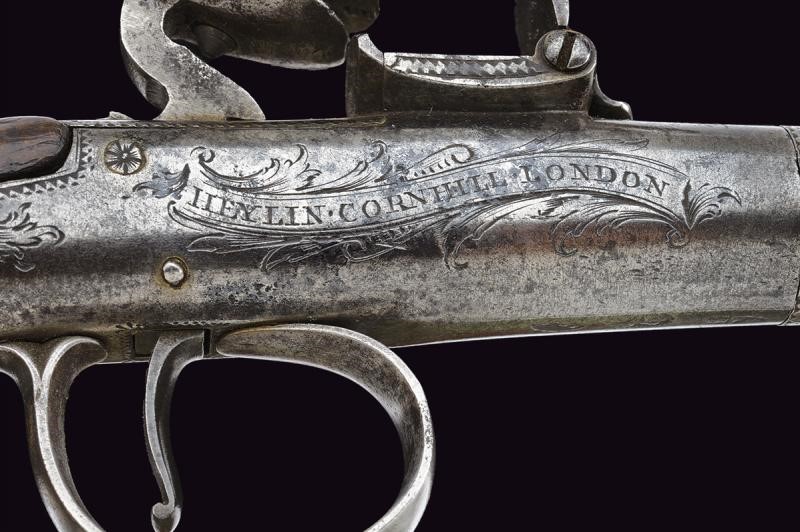 Turn-off, 11,3 mm cal. barrel shaped as a truncated cone and provided with moulded muzzle at the nozzle. Boxlock type frame of almost cylindrical shape, decorated with small floral engravings and a trophy, featuring the cartouche ‘HEYLIN CORNHILL LONDON’, remains of marks on the lower side. Back cock, pan and batterie, working mechanism. Wooden grip with small shell-shaped carving. Dorsal shield and butt-plate, both made of silver; the latter with the effigy of a basket of flowers and birds, and with marks.