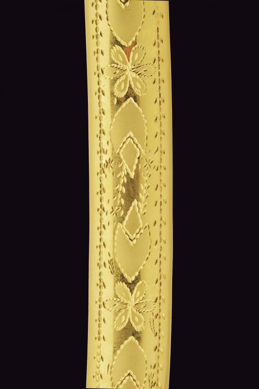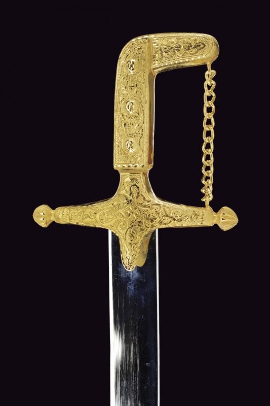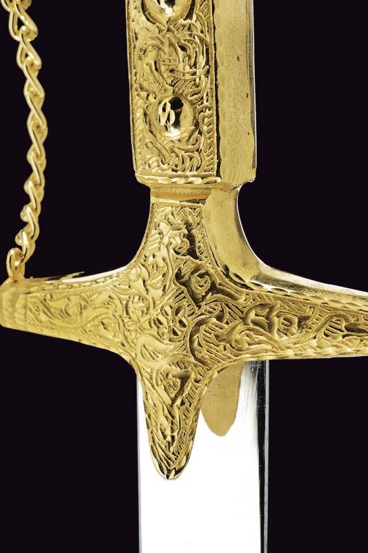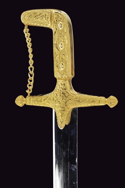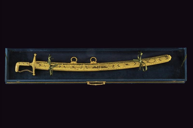Curved, chrome-plated blade, with double fuller. Gilt metal hilt and grip, richly worked with carvings and engravings depicting geometric and floral motifs, chain. Beautiful wooden scabbard covered in gilded metal and worked with short fullers and floral motifs; provided with two lugs. Kept in its presentation case, completely lined in green velvet with rope and filigree elements; on the inside two green satin bands for fastening; on the outside a gilt metal carrying handle.