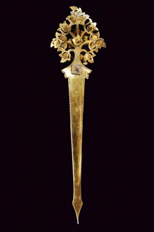 Made of gilded-silver, partially pierced and engraved, the upper part shaped as a leaf, decorated with small rubies (one is missing).