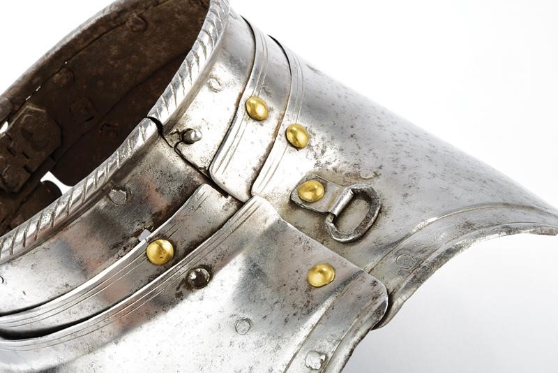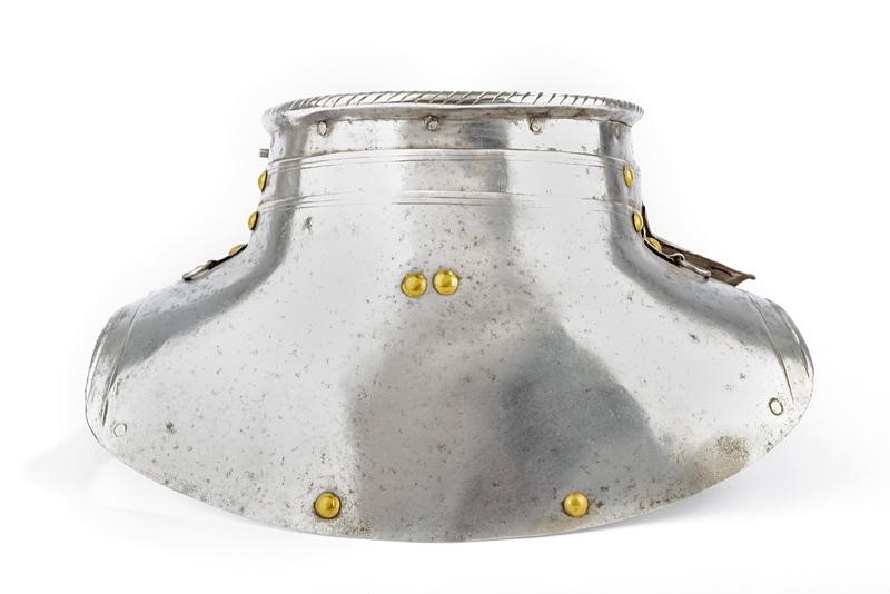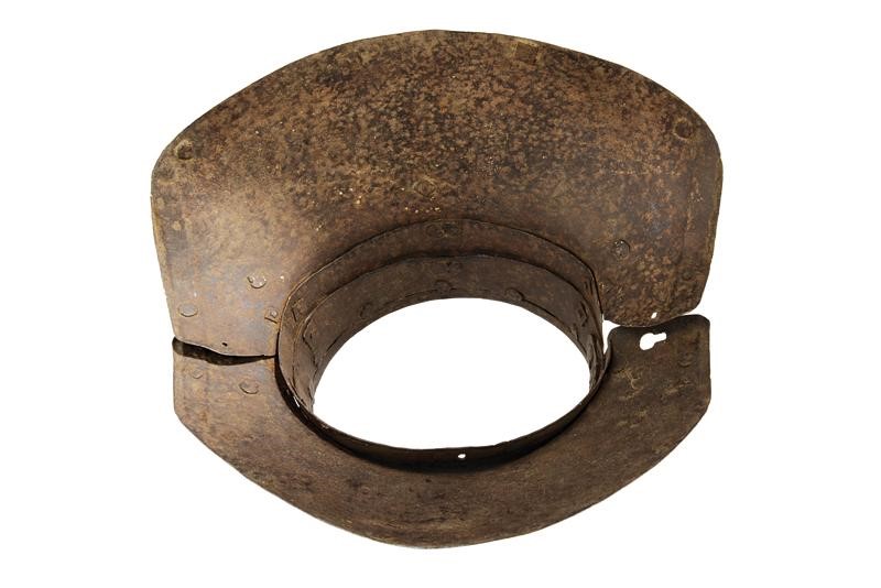 Made of iron, neck-plate with hemmed and twisted border; two plates decorated with double lines at the upper border and with swallow-tailed at the side margins. Two rings to fix the shoulders; missing locking pin.