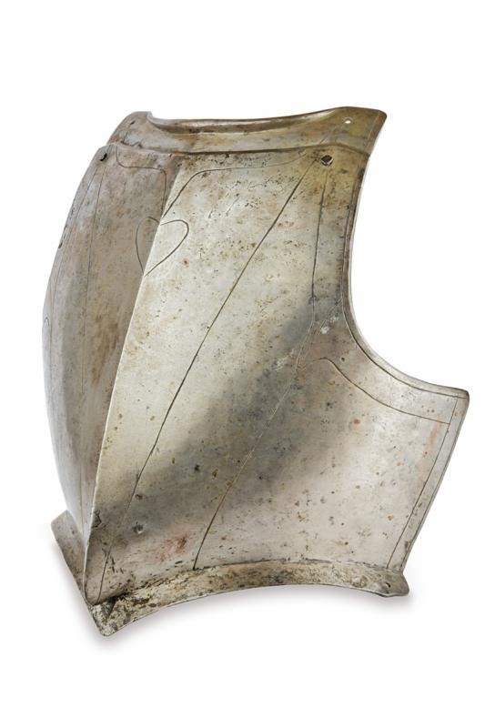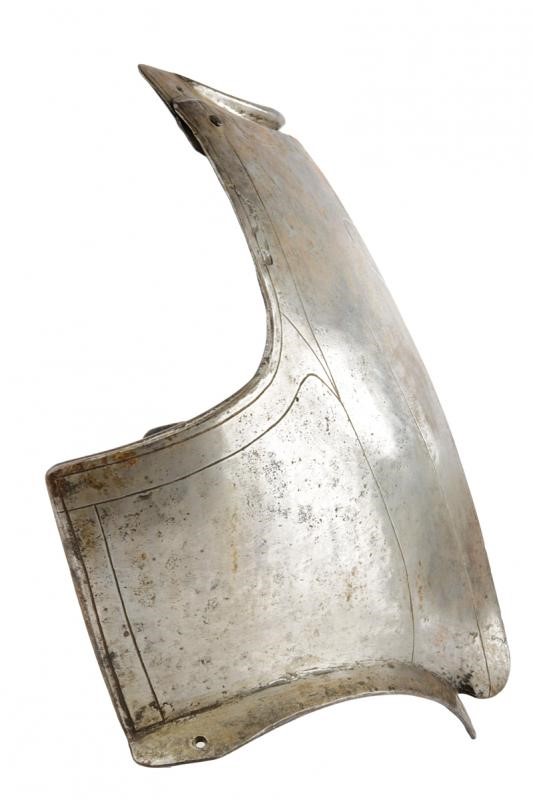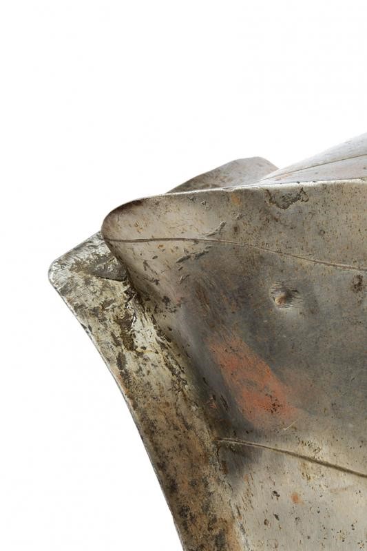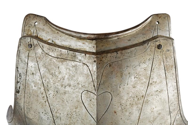 Made of iron, ribbed at the center, with tapul in the lower part, featuring an engraved heart at the centre and the side parts engraved with curved lines; movable neckline with hemmed border. With visible hammering and some small exfoliations inside.