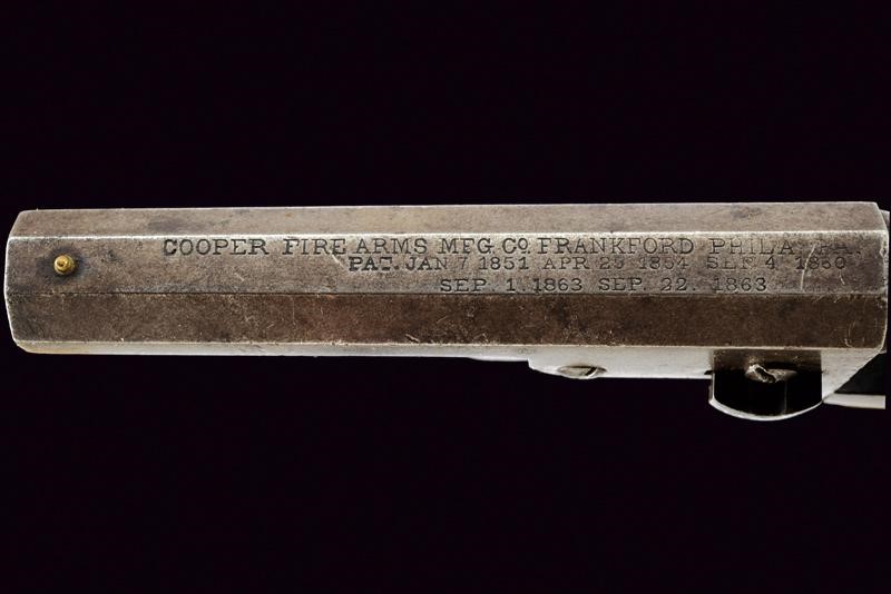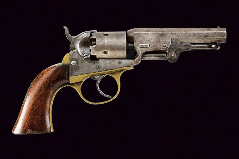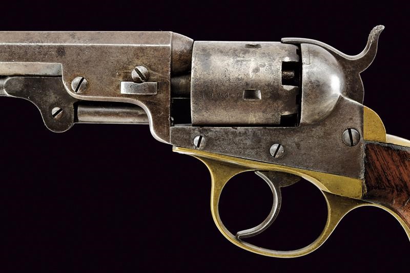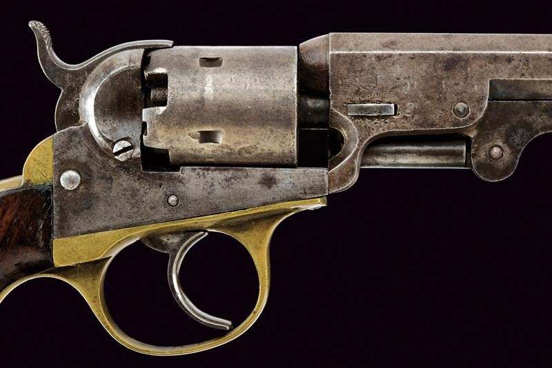 Octagonal, rifled, 4", 31 cal. barrel (signs of use, visible rifling), with brass conical foresight. Three-line marking on the back with the inscription "FRANKFORD PHILA", patent markings. Matching serial numbers on barrel and cartridge rammer, wedge without numbers. Five-shot cylinder. Working mechanism in both double and single action. Brass trigger guard and grip bands, both numbered ‘43xx’, also on the cylinder. Walnut grip. Philadelphia Second Model.
