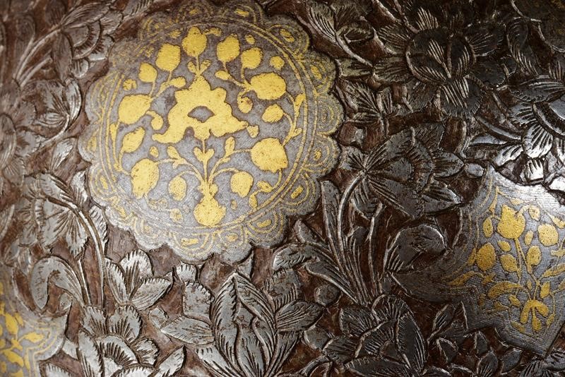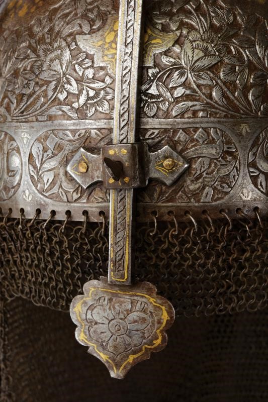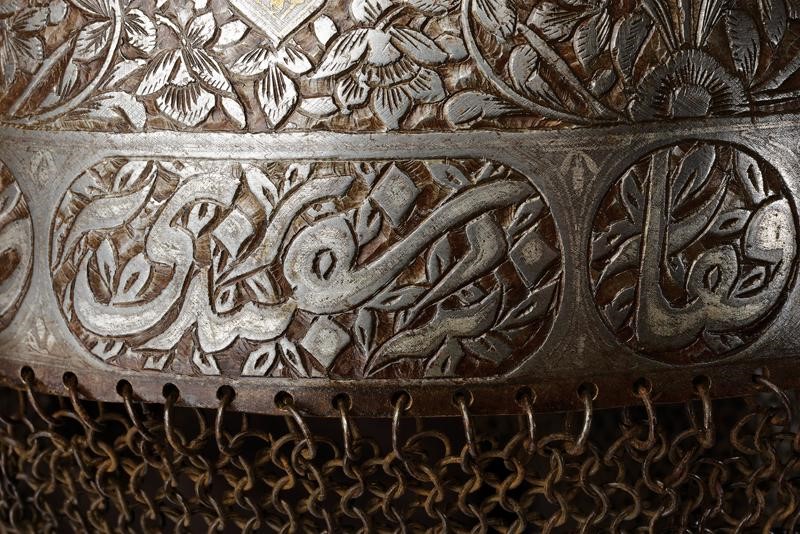 Hemispherical iron skull, surmounted by a square cusp mounted on a round base, engraved sliding nasal bar, with two side plume-holders, the entire surface engraved with floral motifs partially gilded, the border with a band featuring silver-inlaid inscriptions in Arabic; fringed mail neck-defense with simple closed rings.