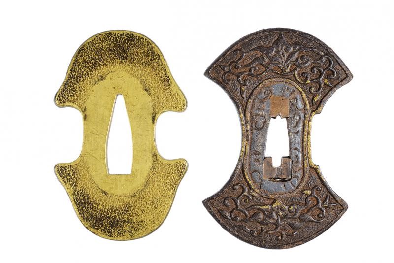 One made of iron with hollow sides, decoration in relief, with remains of gilding and provided with sekigane. The other of similar shape, made of brass.